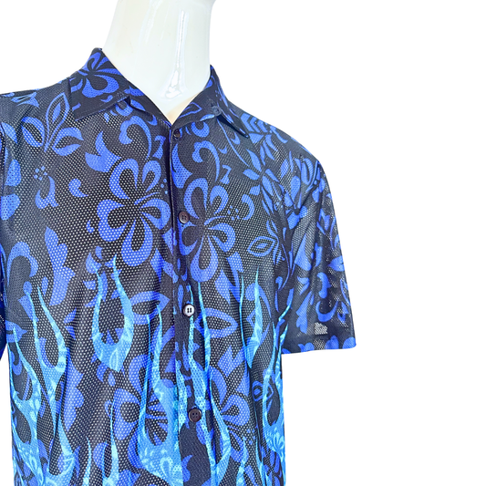 Blue flower motif mesh shirt - M