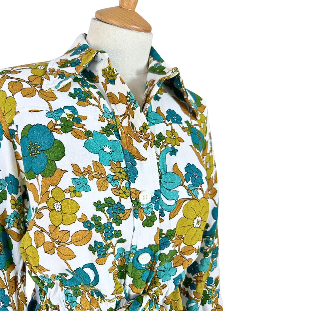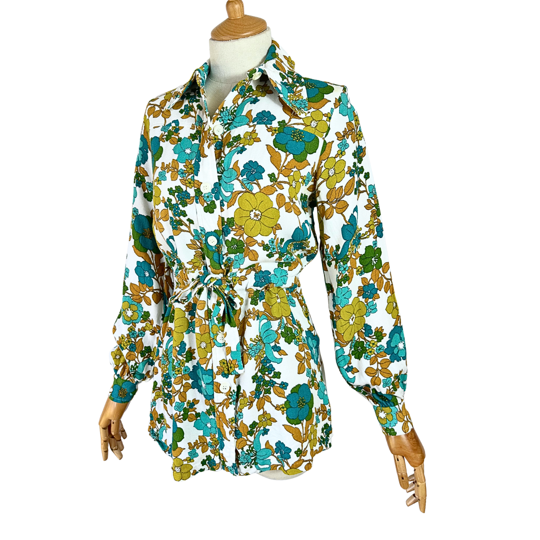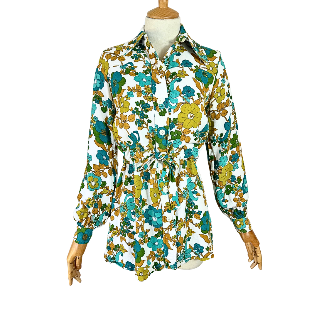 White, teal, brown, and olive green 70s vintage floral longsleeve shirt with a drawstring waist.
