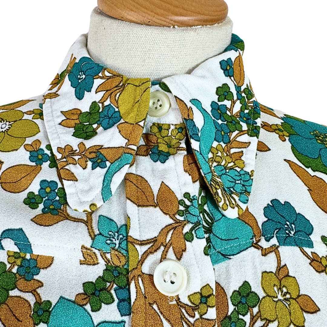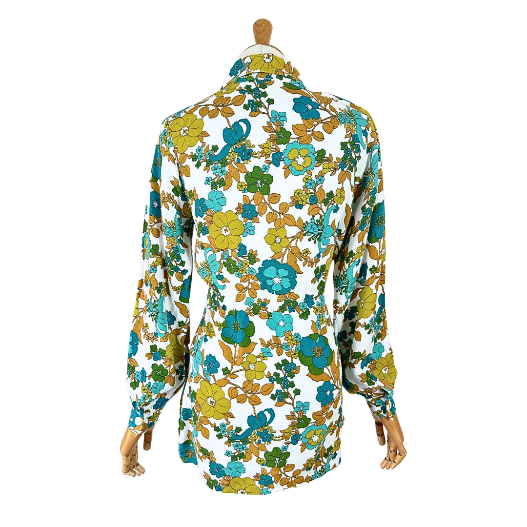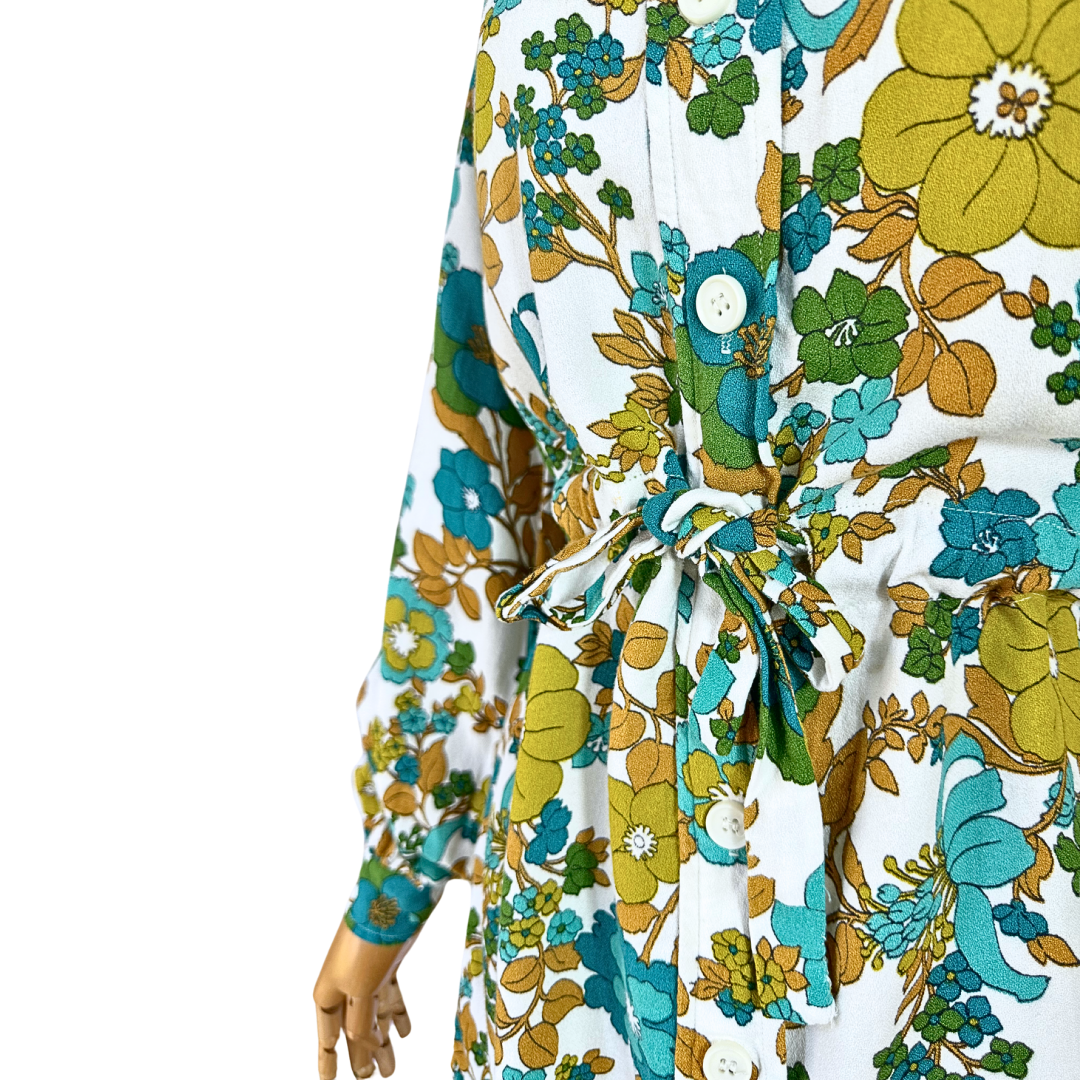 White, teal, brown, and olive green 70s vintage floral longsleeve shirt with a drawstring waist.