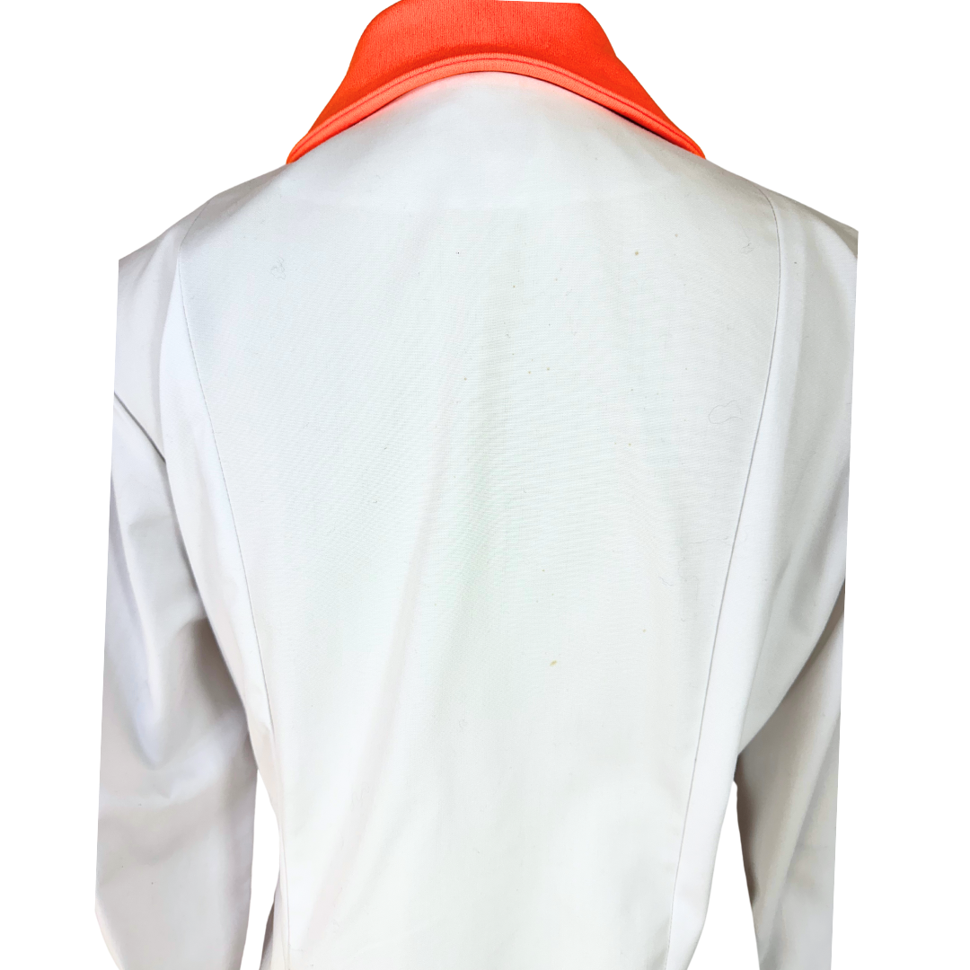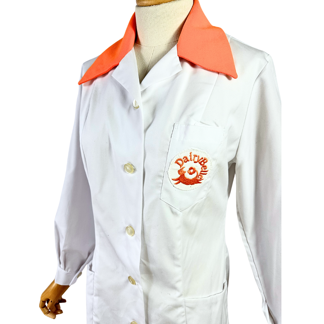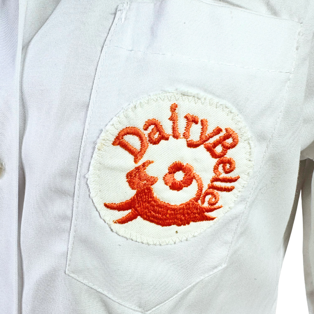 White vintage 70s milkmaid Dairybelle uniform dress with front button closure. Has an embroidered logo on the front and two front pockets.