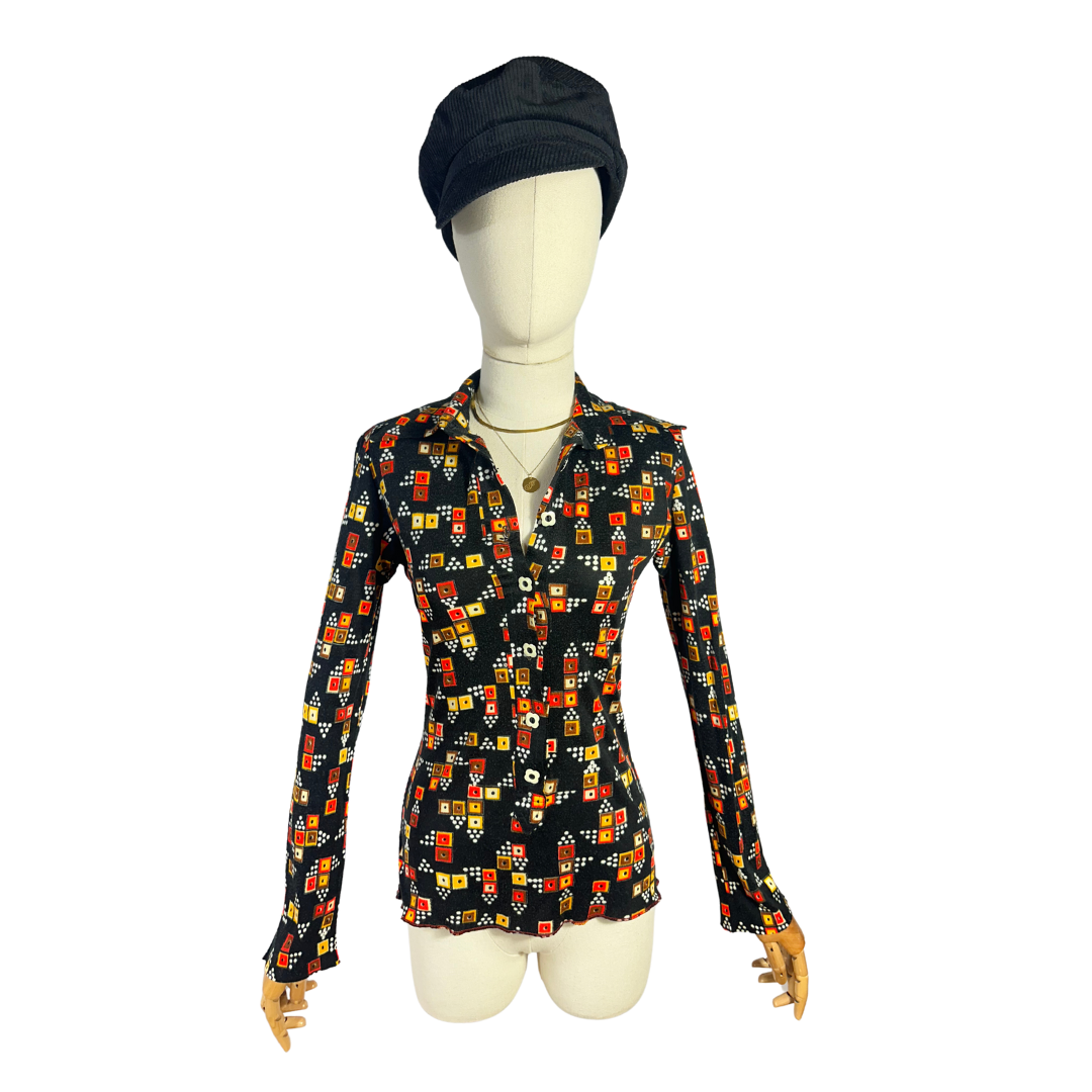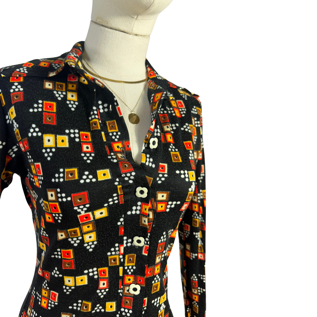 Brown, black, and orange 70s vintage geometric print shirt.