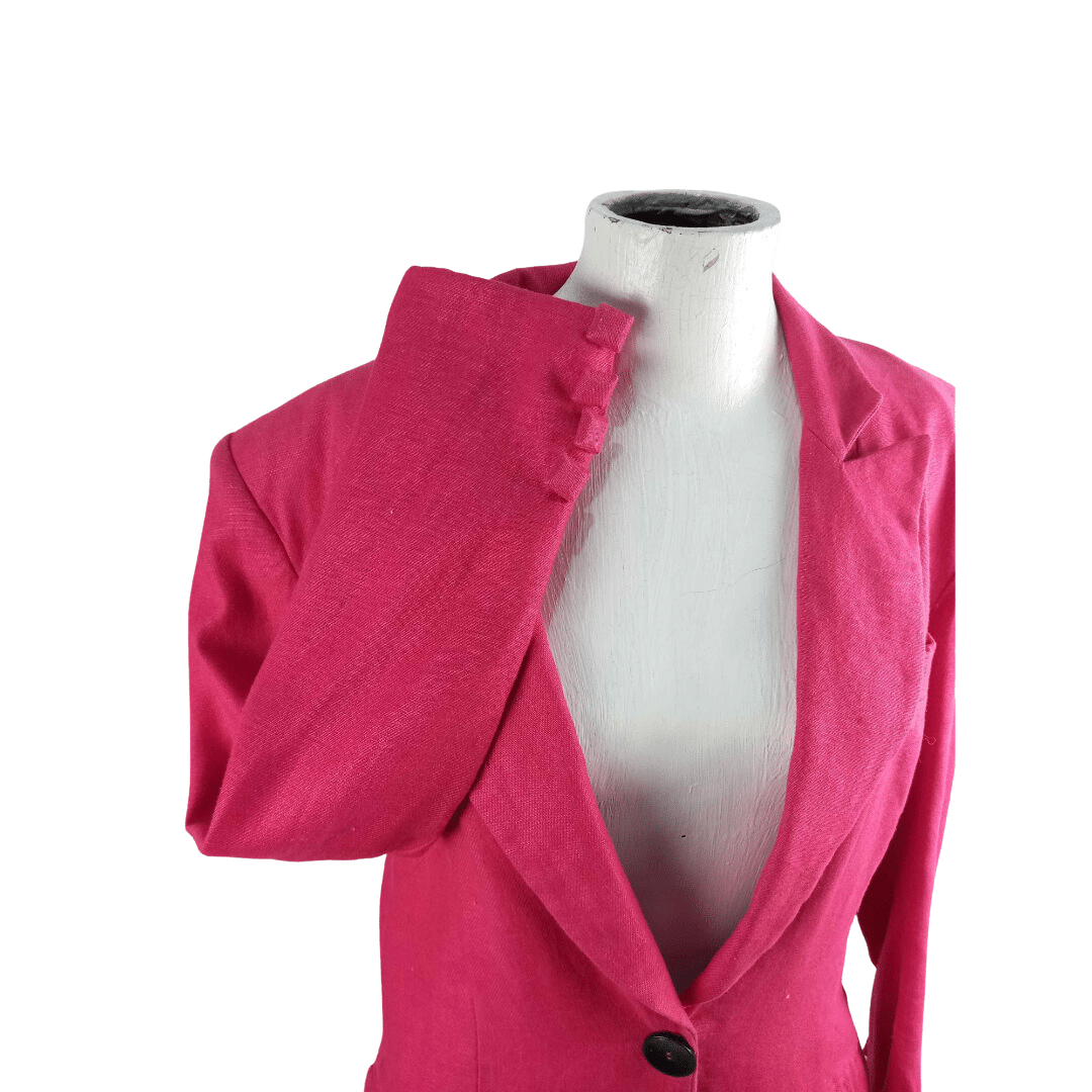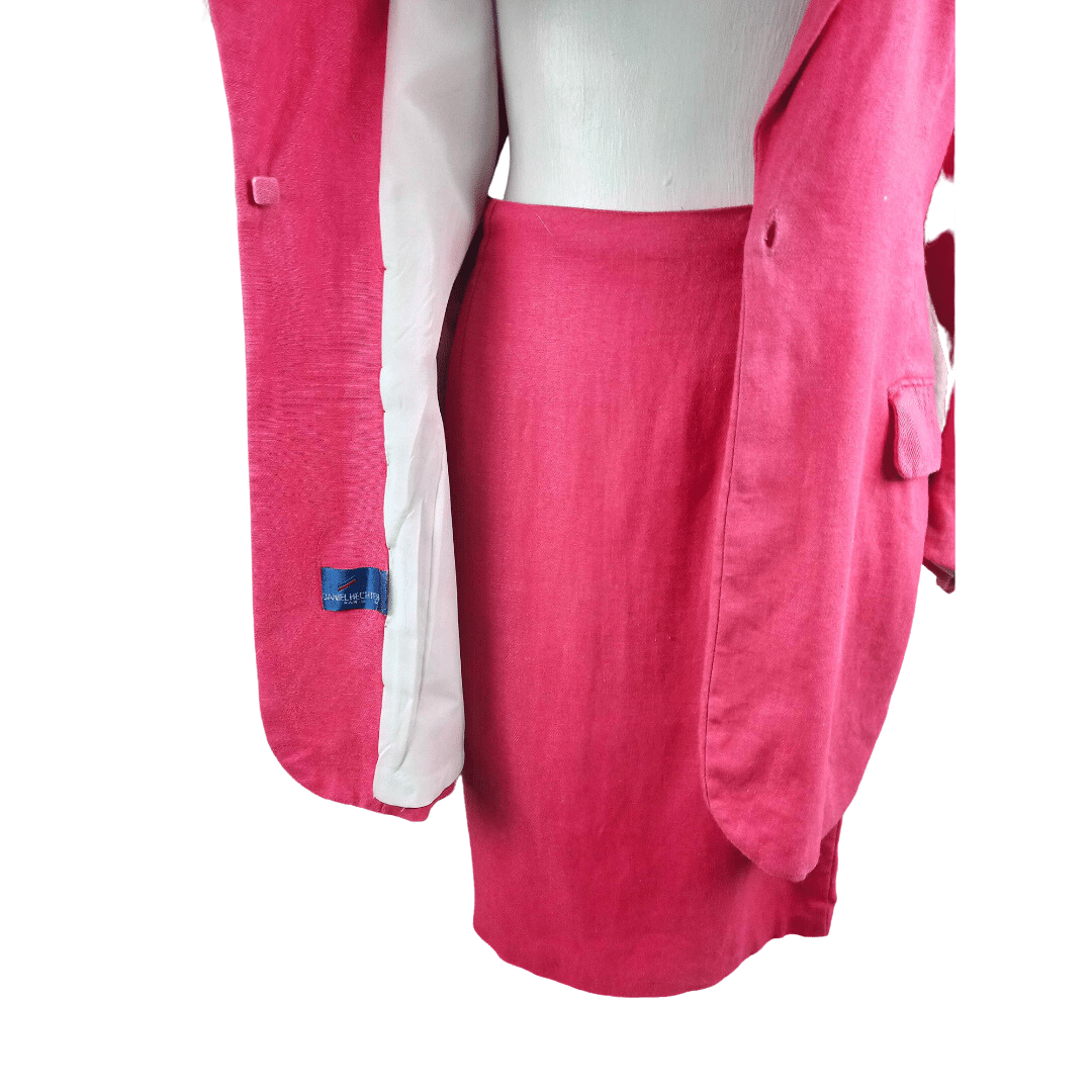80s power suit by Daniel Hechter in fuchsia. The single-breasted blazer is padded and has a matching high-waisted pencil skirt that zips at the back.