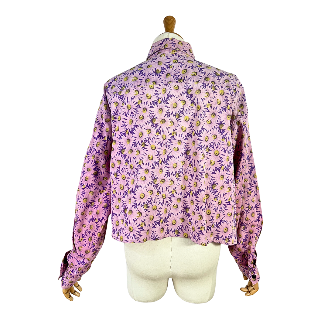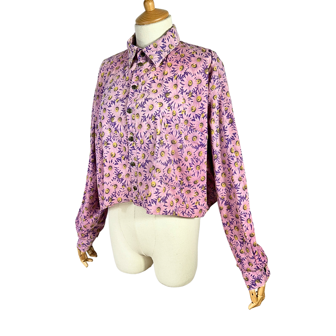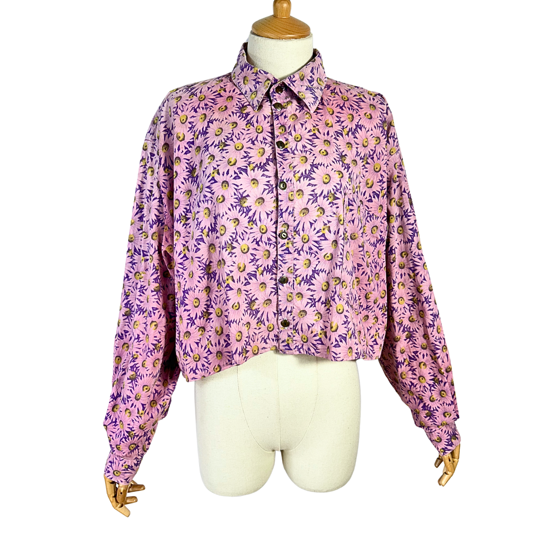 Pink and purple 90s floral longsleeve cropped shirt. Has one chest pocket.