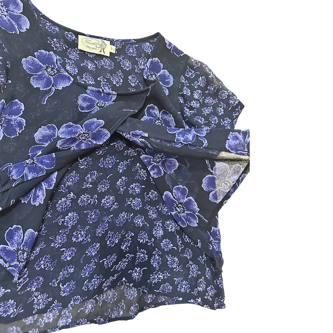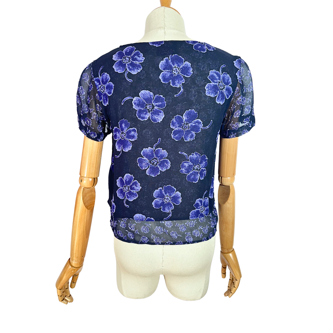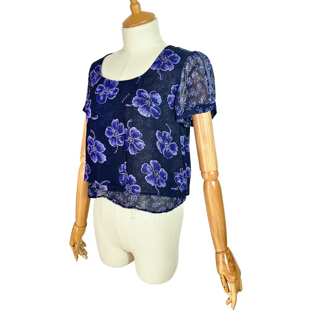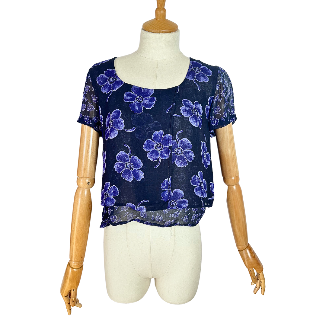 Blue and purple 90s floral shortsleeve overlay cropped top.