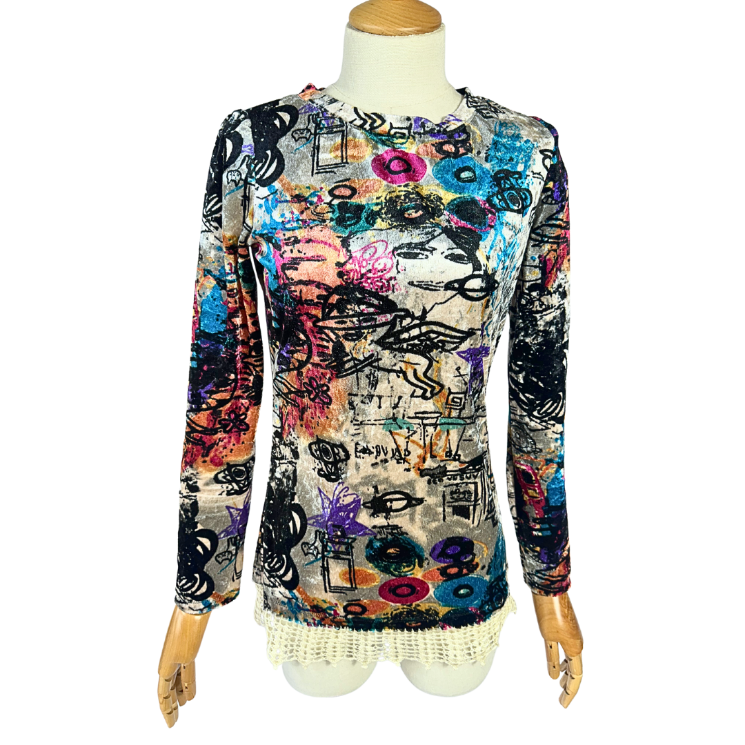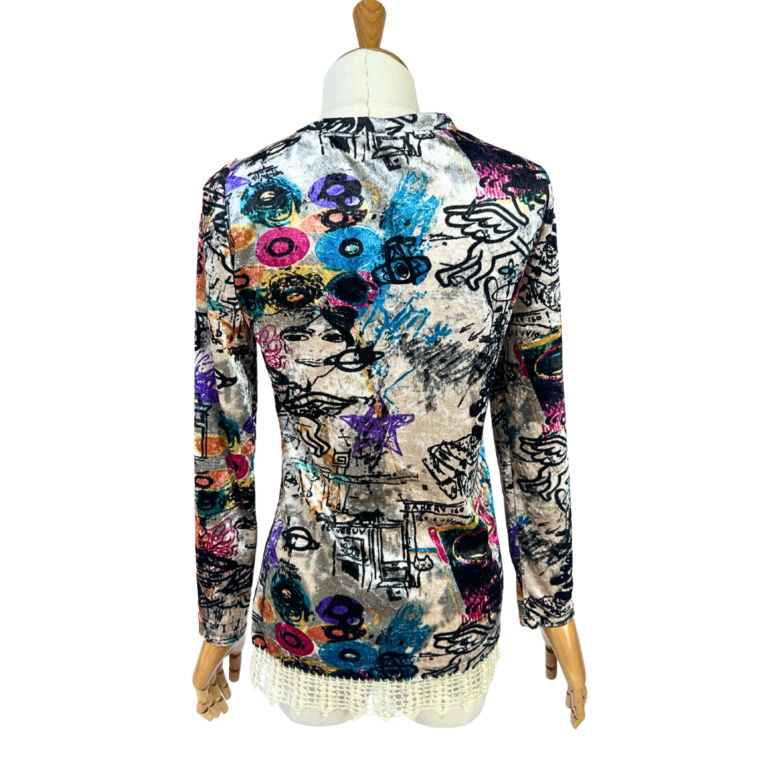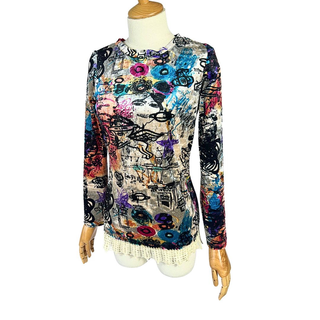 Grey, pink, blue, black, and purple 90s grunge graffiti velour longsleeve top with crochet hem.
