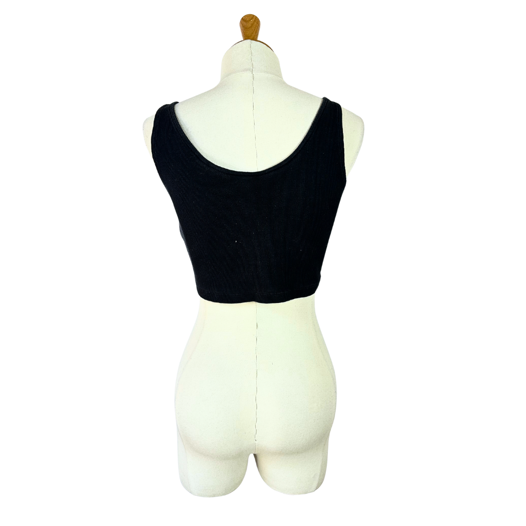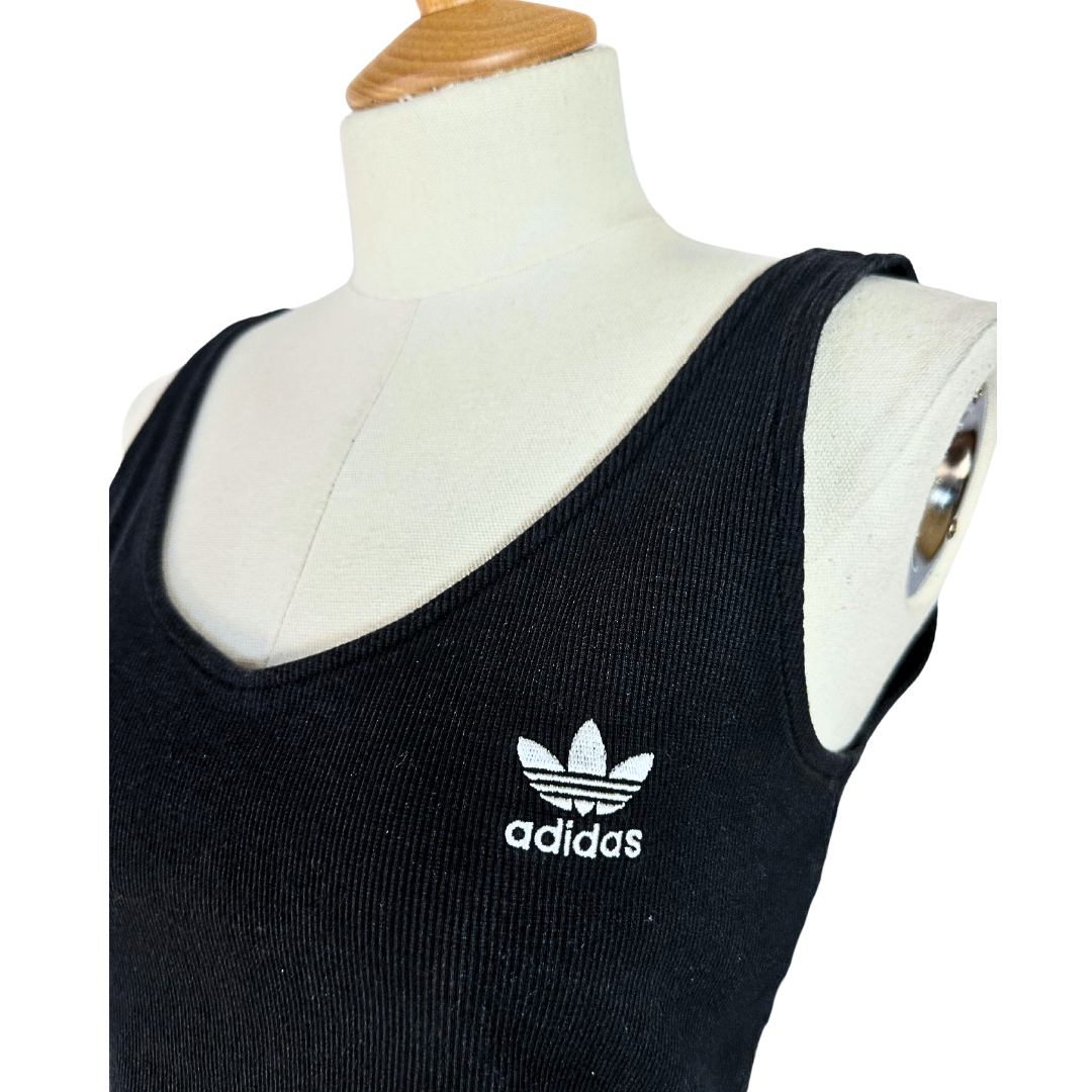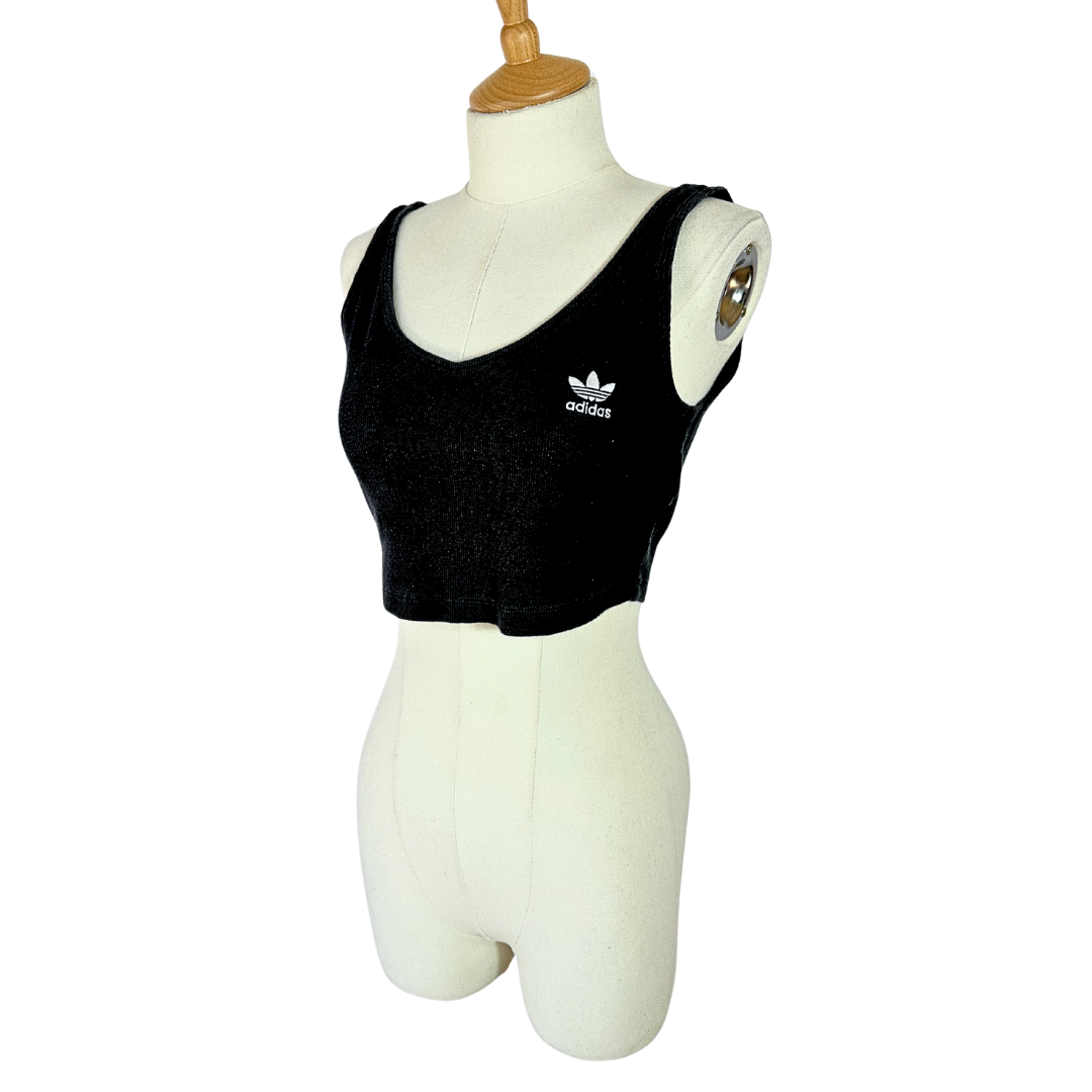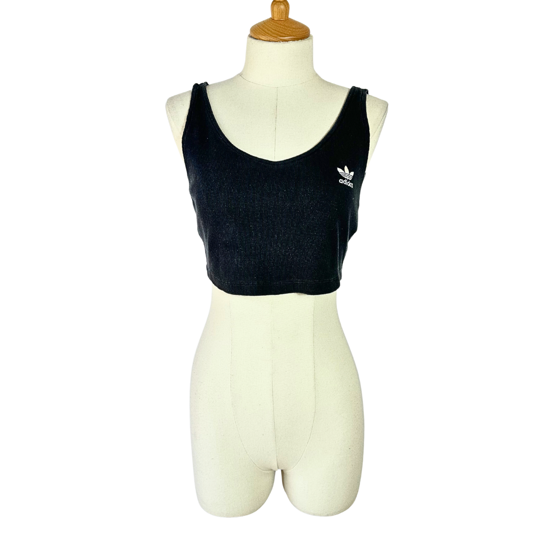 Black Adidas ribbed sleeveless cropped top. Has an embroidered logo on the front.