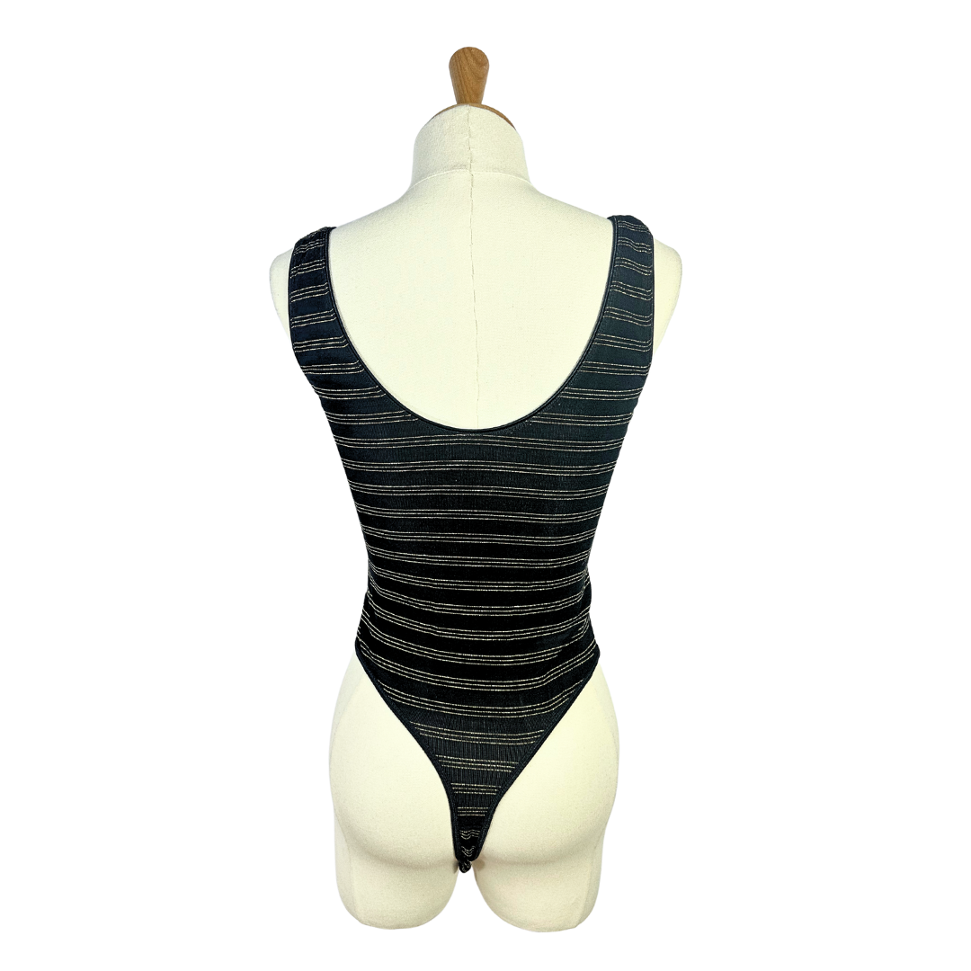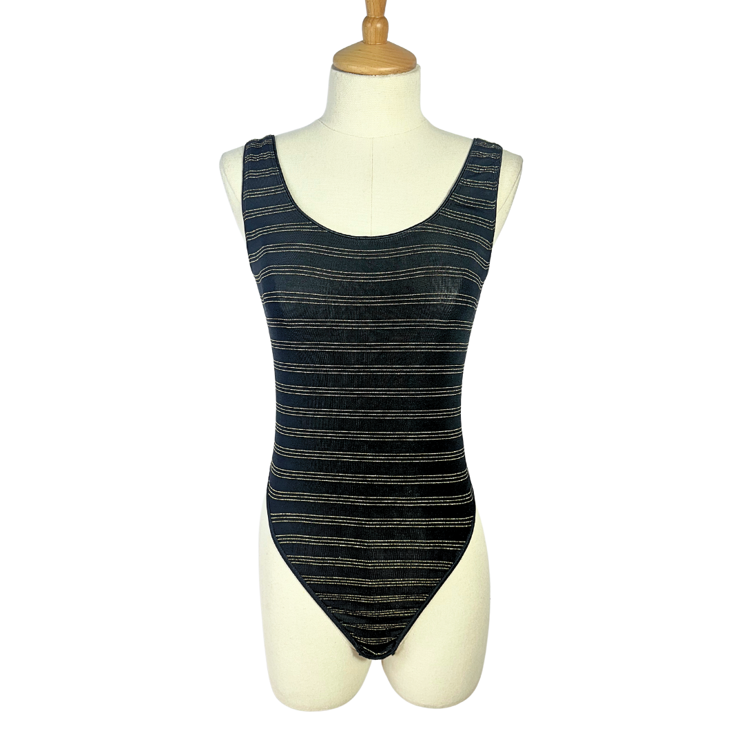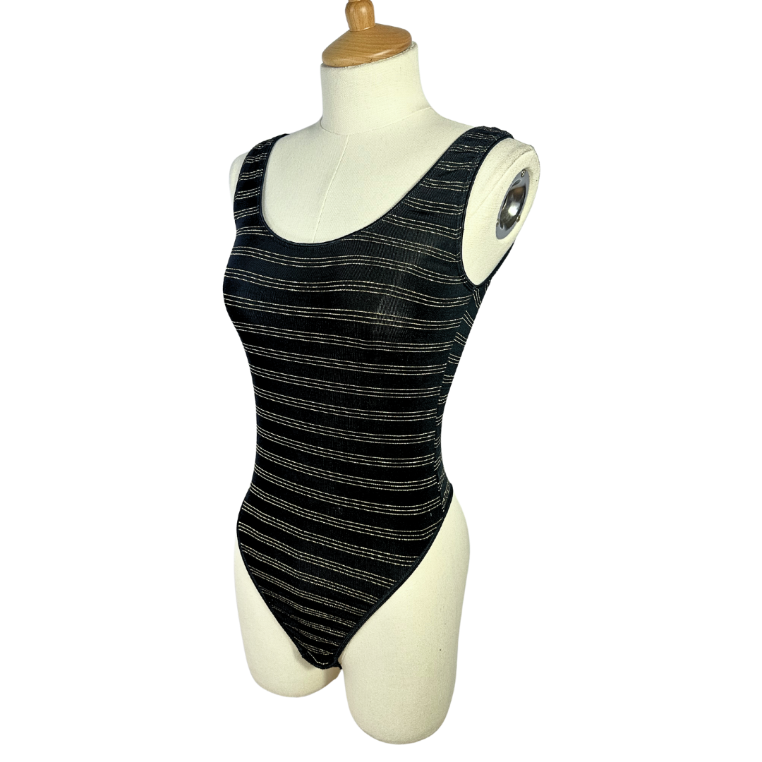 Black and gold striped sleeveless ribbed bodysuit. Scoop neck and has a snap button closure at the crotch area. Fabric has some stretch to it.