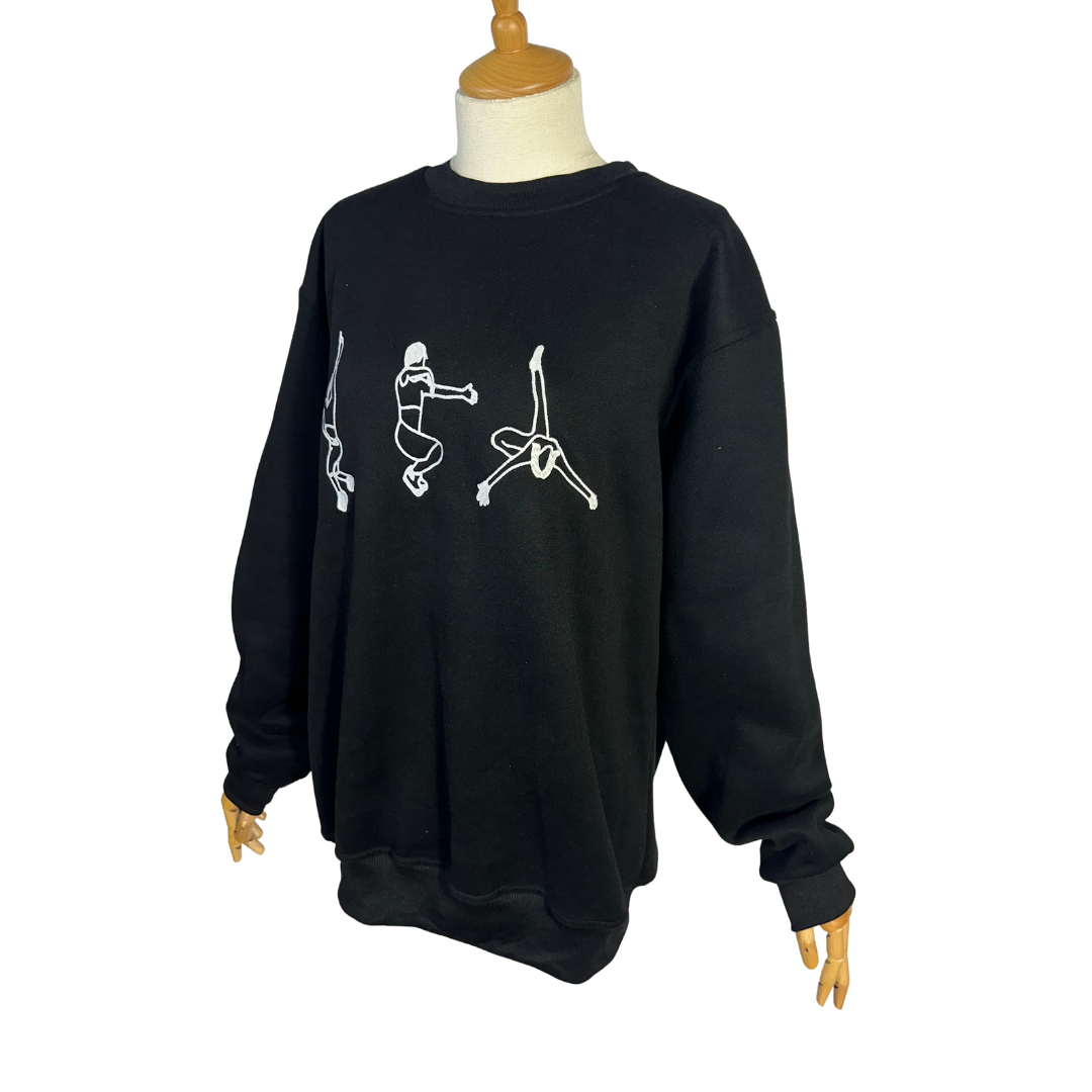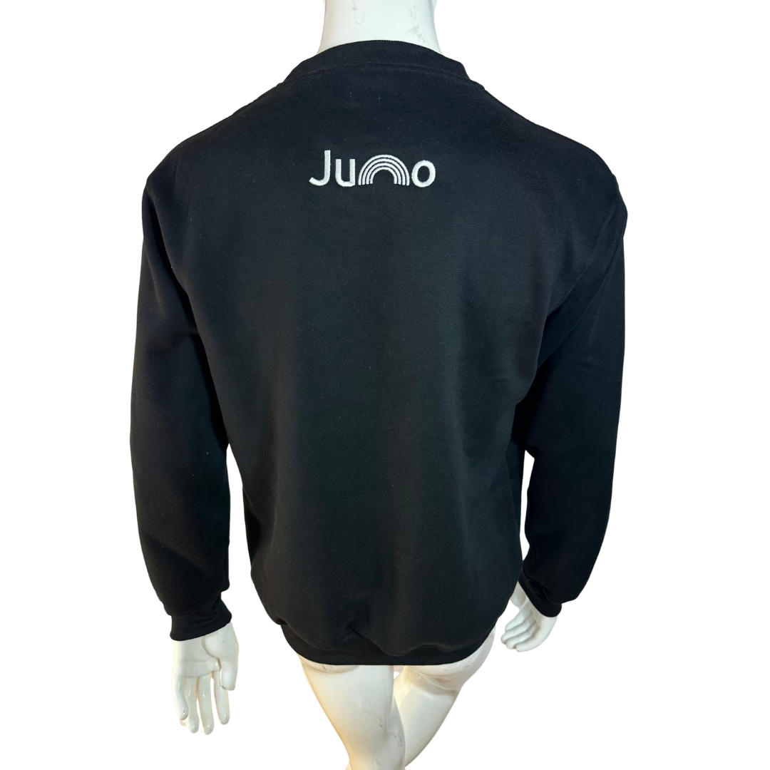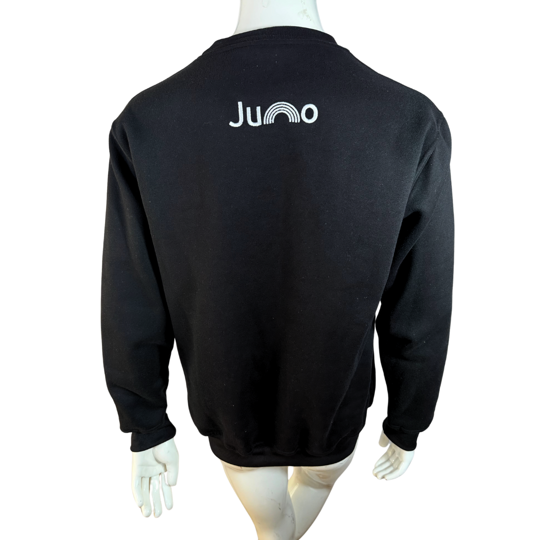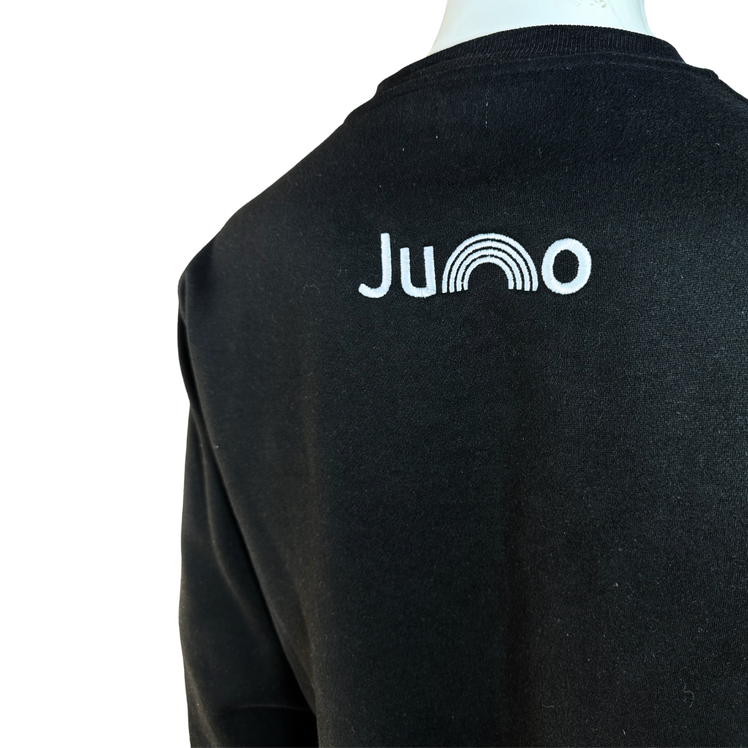 Black Juno voguing embroidered cotton sweatshirt. 350gsm cotton fibre with ribbed collar, cuffs, and hem. Brand new. Comes in different sizes.