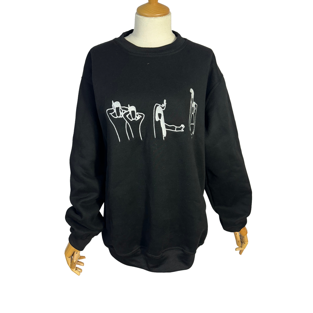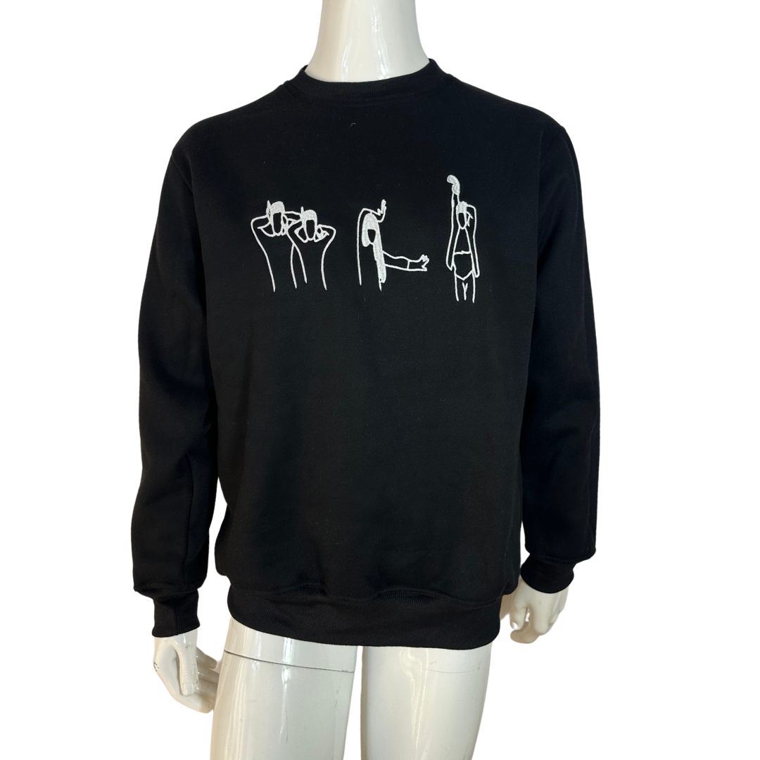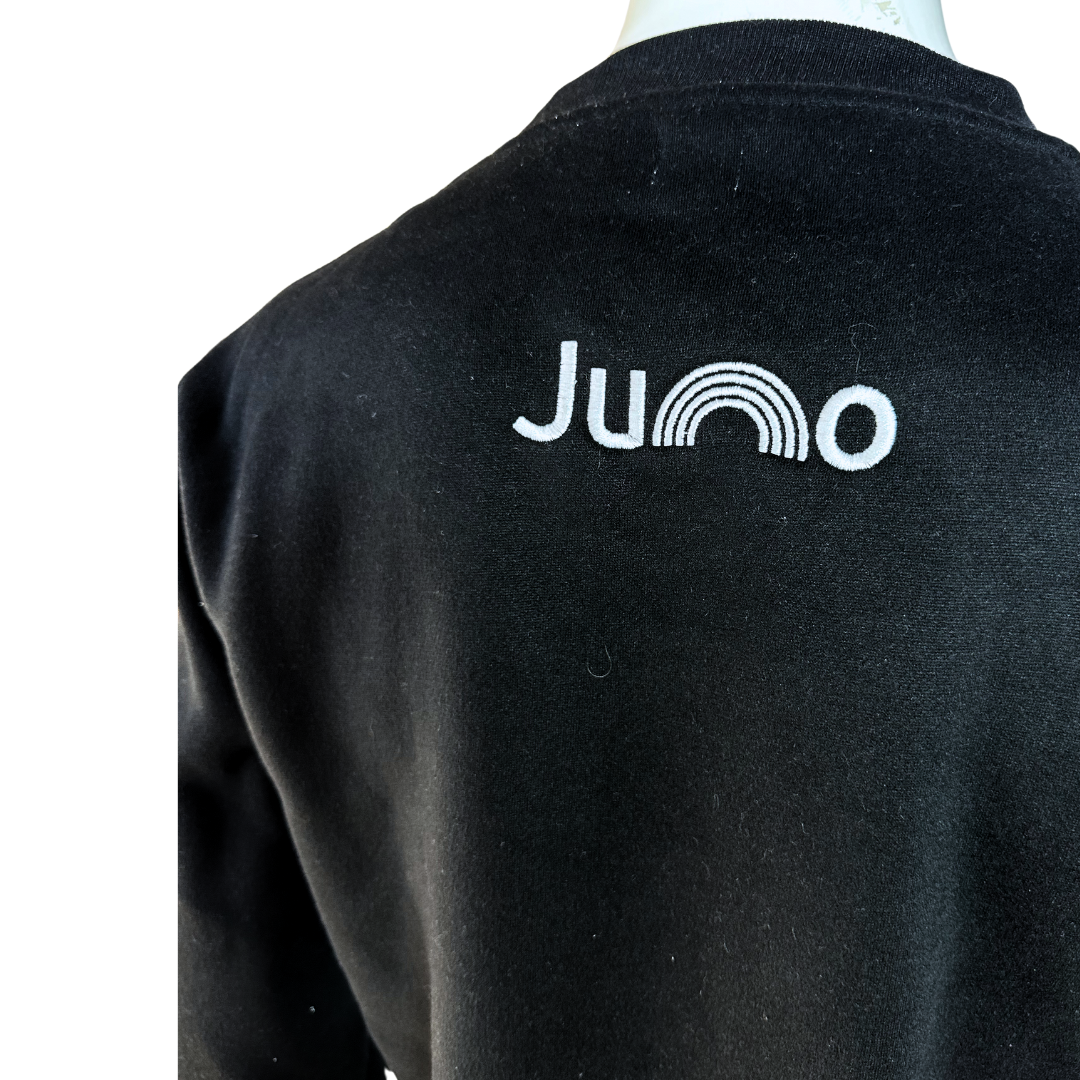 Black Juno voguing embroidered cotton sweatshirt. 350gsm cotton fibre with ribbed collar, cuffs, and hem. Brand new. Comes in different sizes.