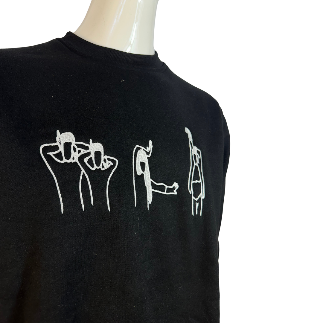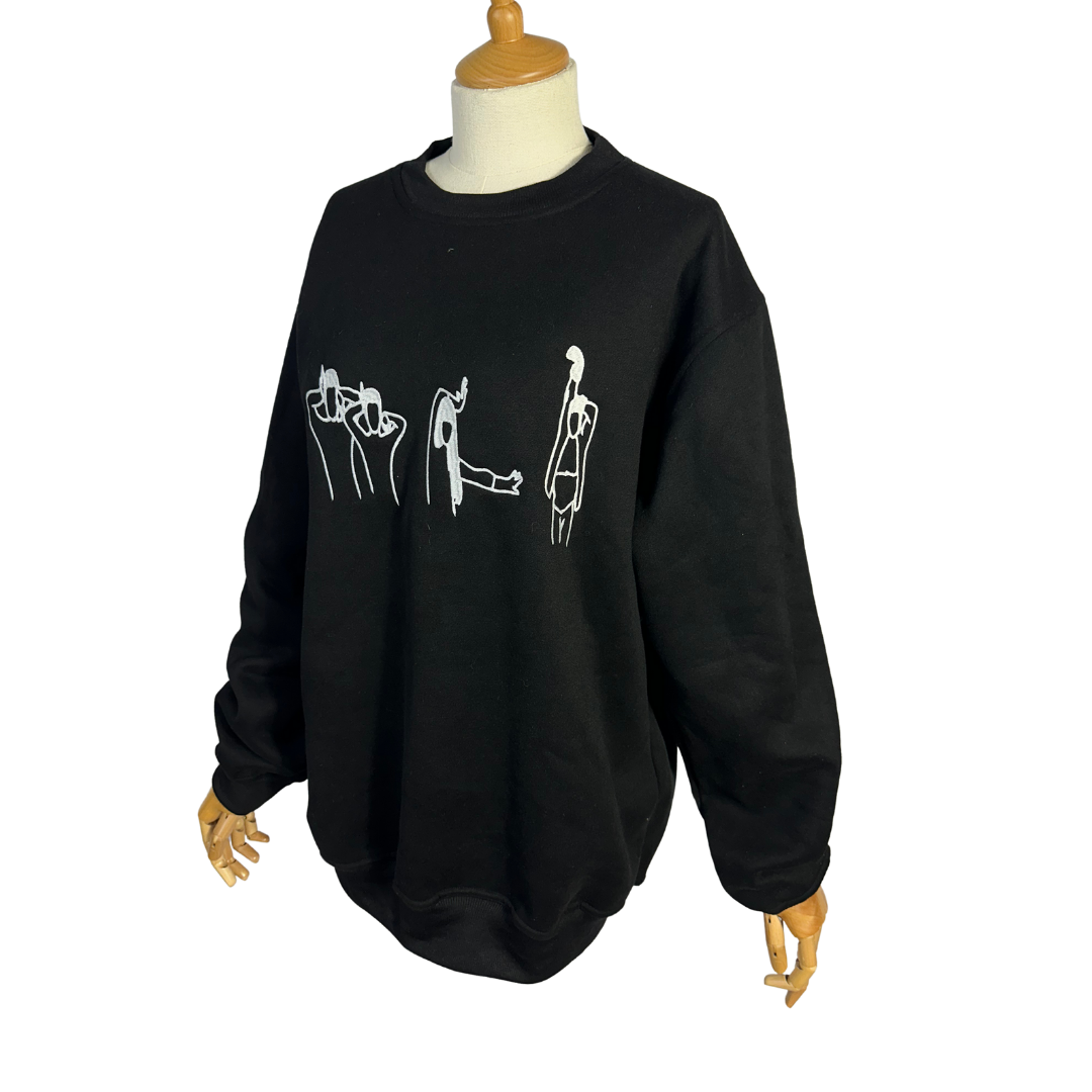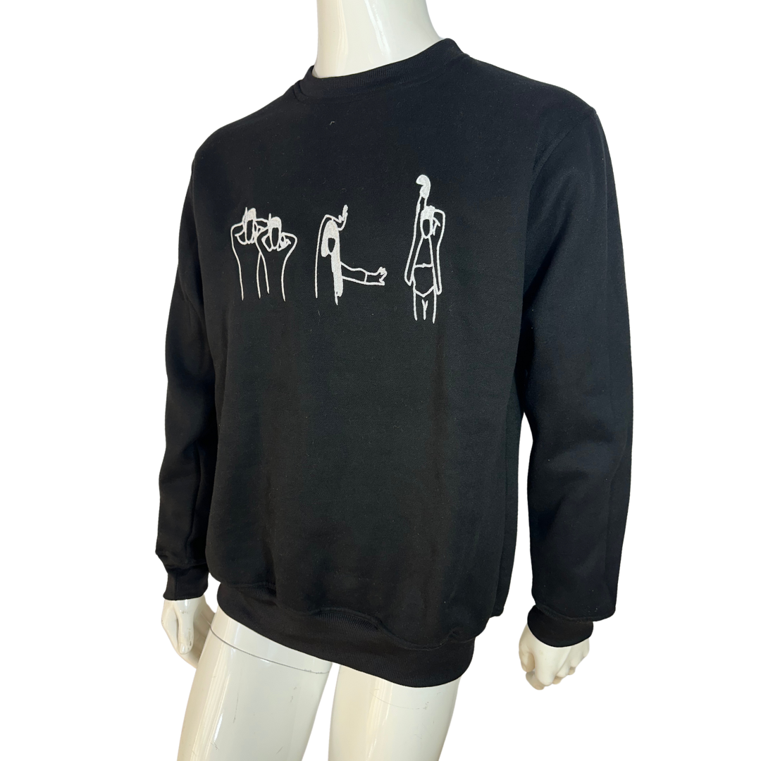 Black Juno voguing embroidered cotton sweatshirt. 350gsm cotton fibre with ribbed collar, cuffs, and hem. Brand new. Comes in different sizes.