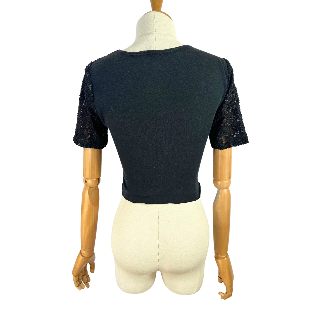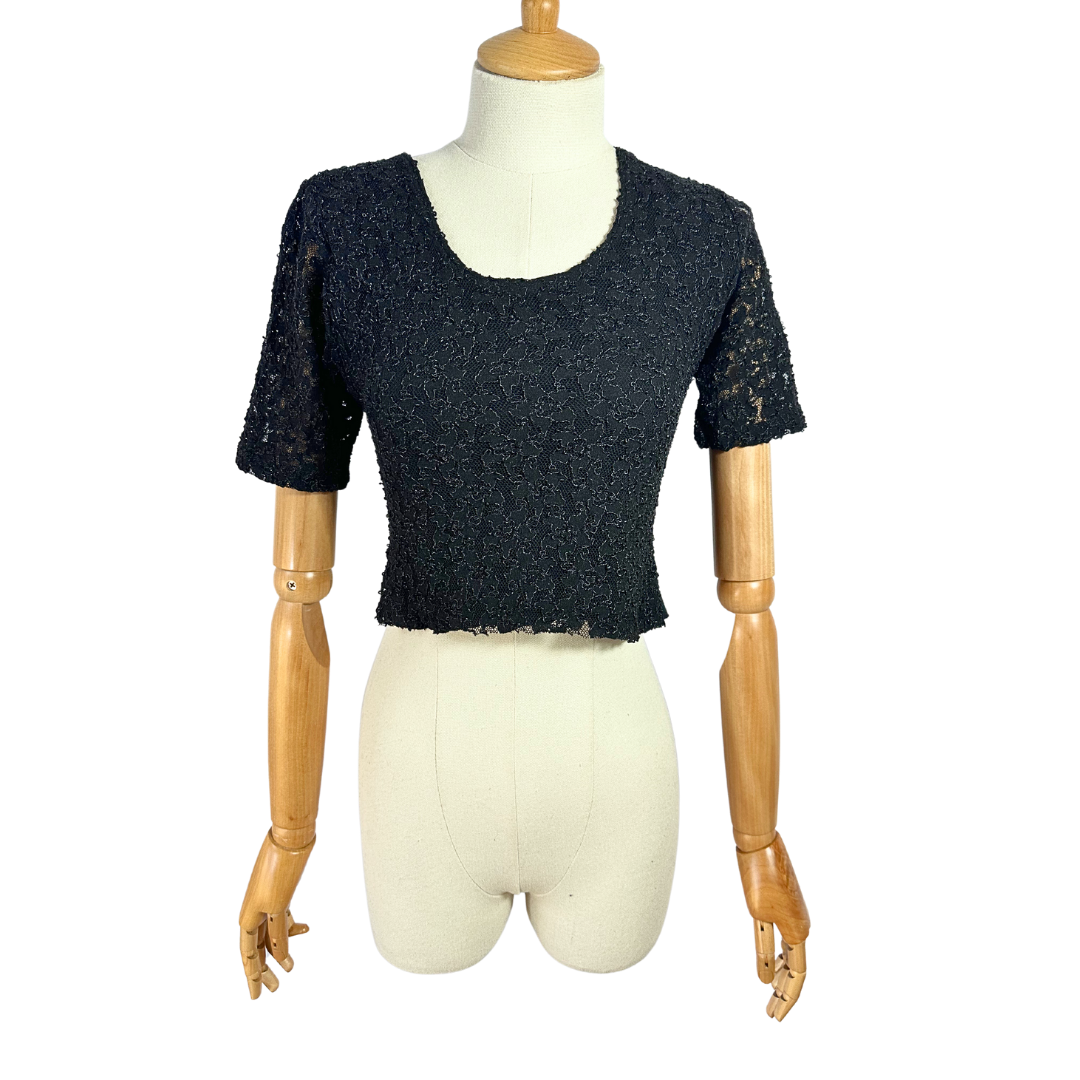 Black floral lace shortsleeve cropped top. Lined. Round neckline.