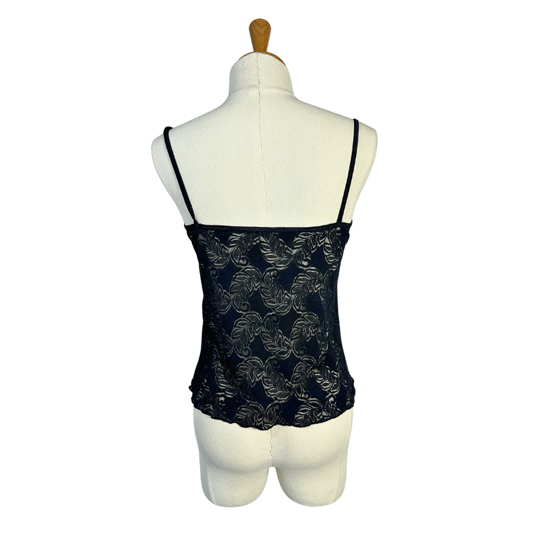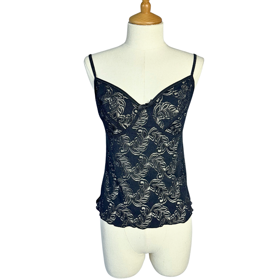 Black vintage sheer leaf pattern spaghetti strap lingerie top.