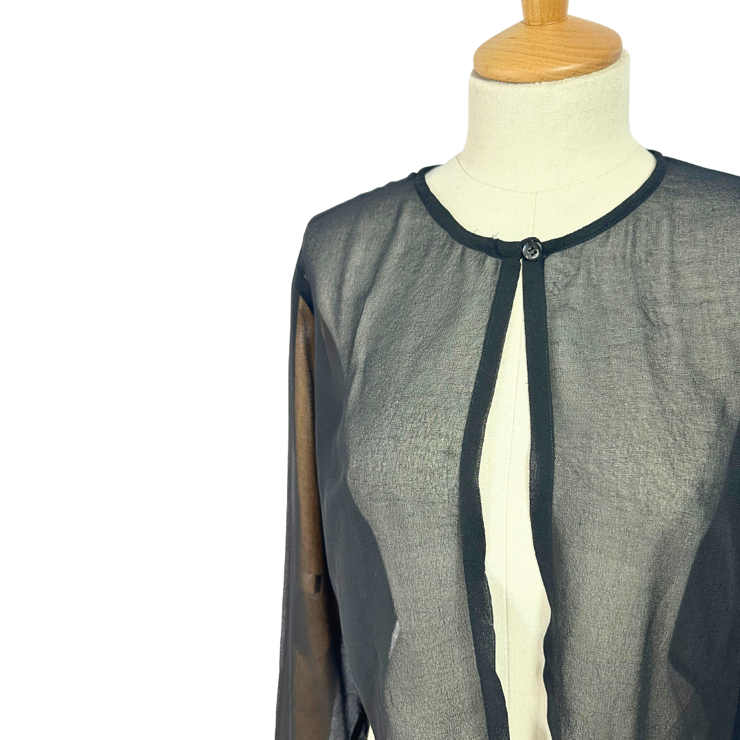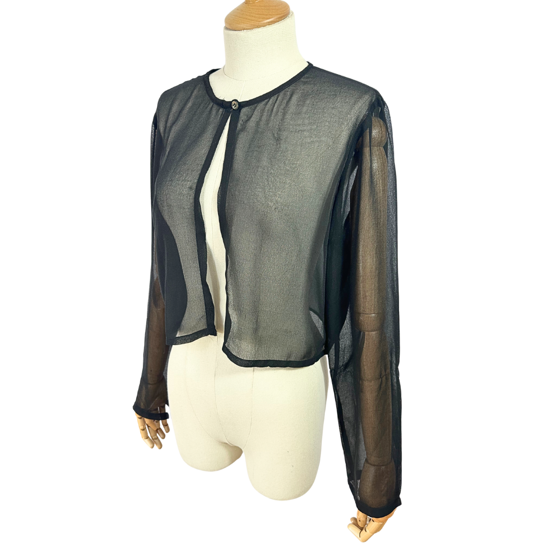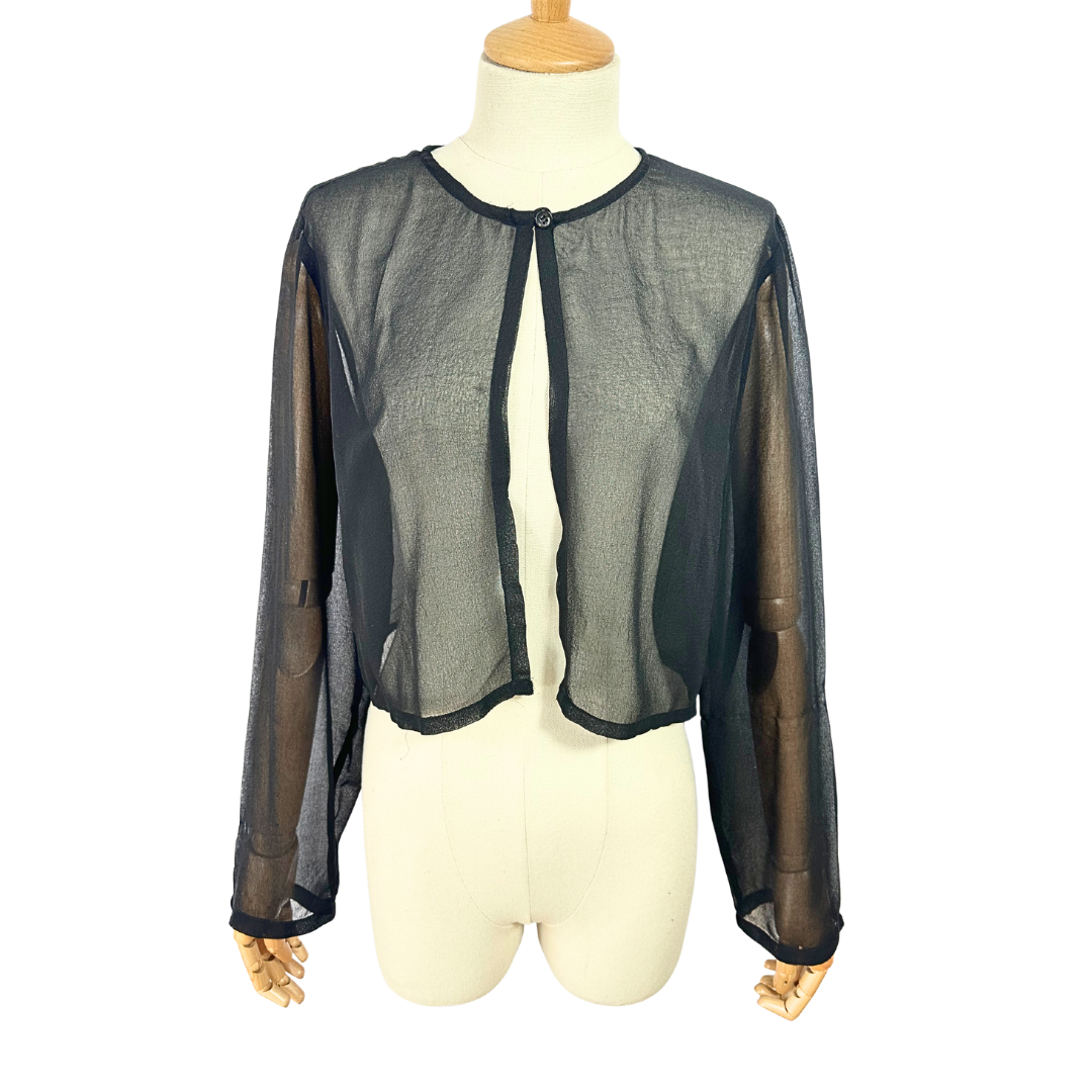 Black 90s sheer longsleeve jacket. Has a single-button closure.