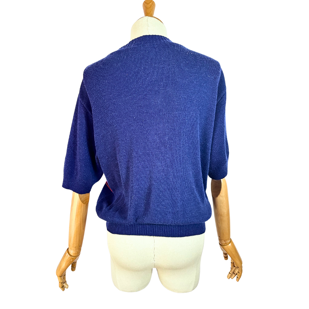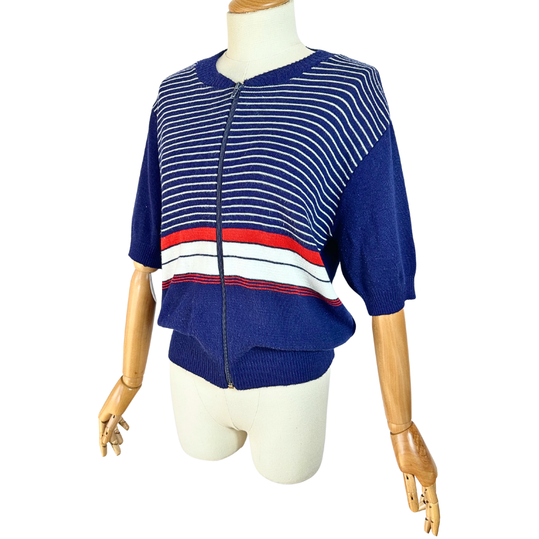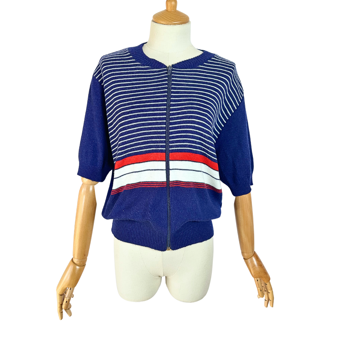 Blue, white, and red 70s vintage striped zipped-up knitted top. Has a ribbed hem.