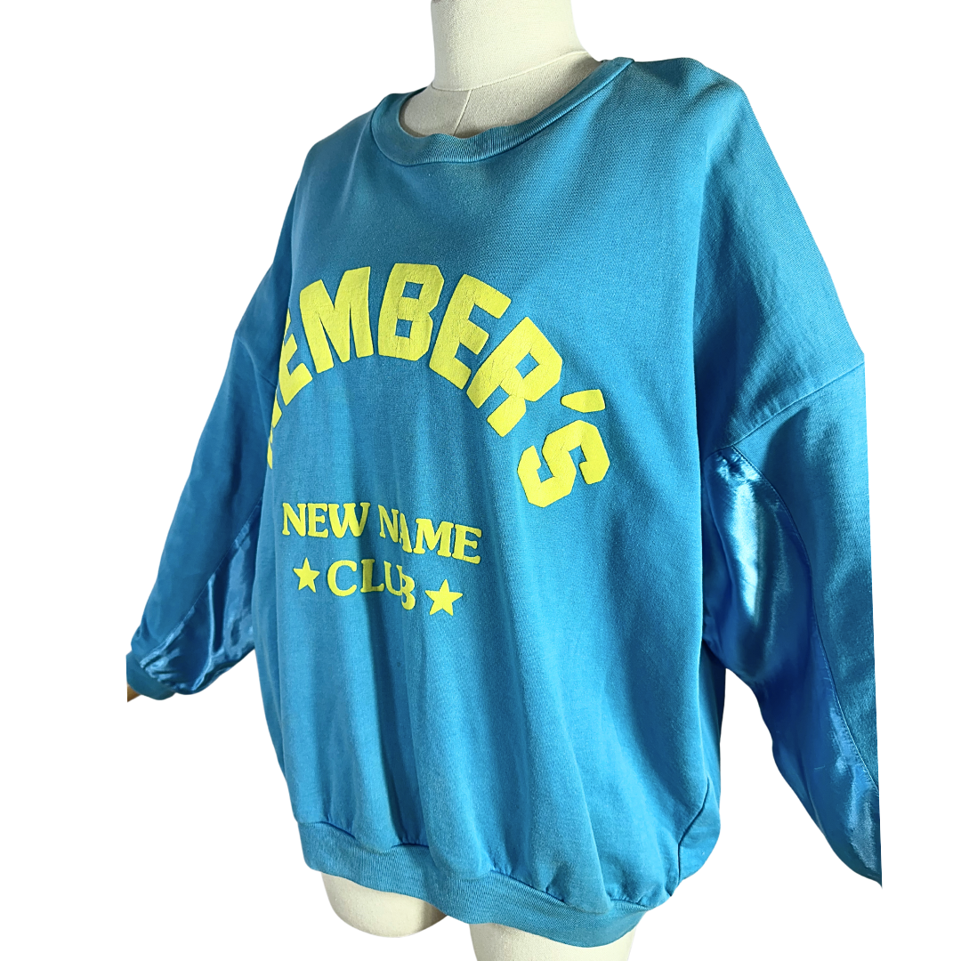 Sky blue 90s sweatshirt with embossed text in yellow. Has a ribbed cuff and hem. Satin insert on the sleeve.
