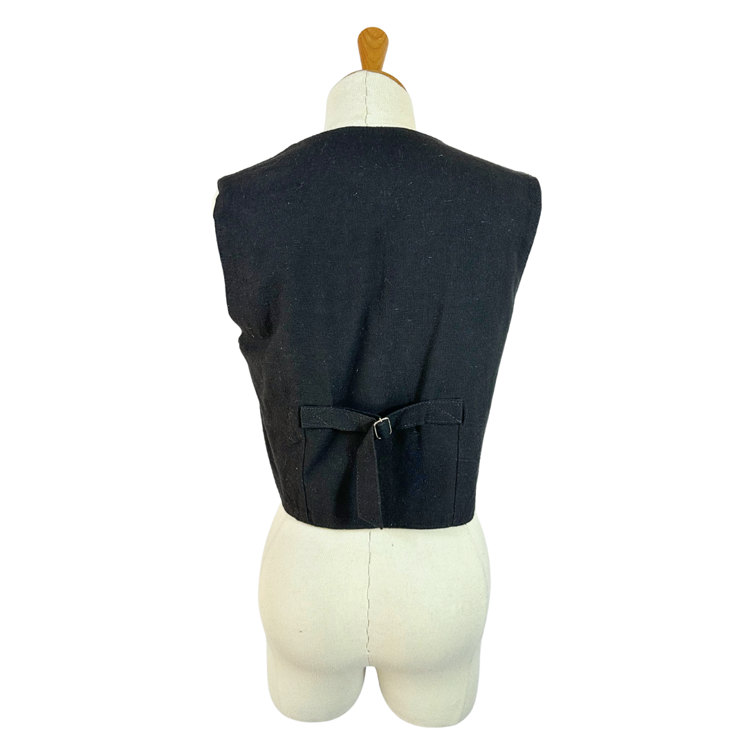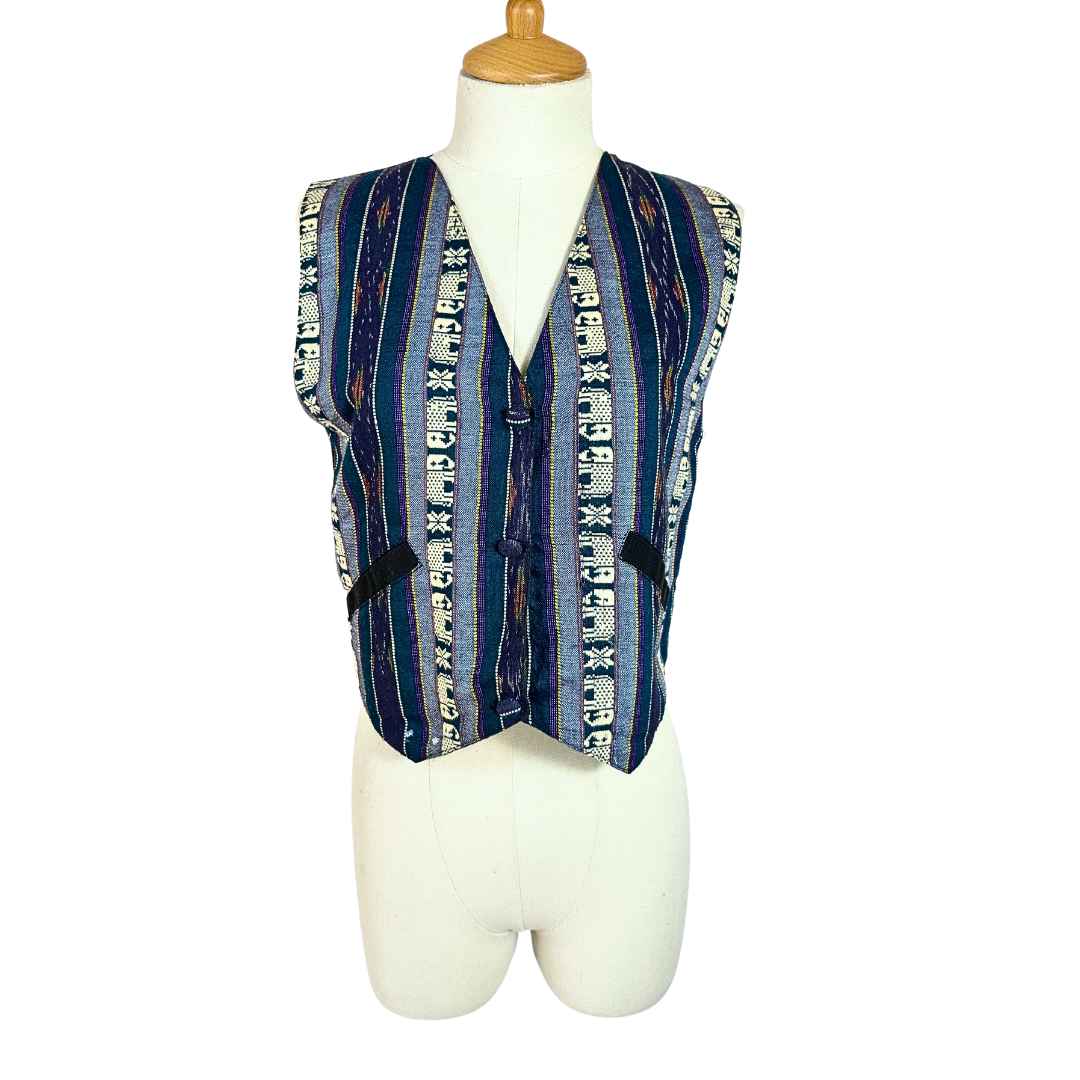 Blue and black vintage aztec Navajo tapestry cropped waistcoat. Has a front button closure, two front pockets, and adjustable strap at the back.