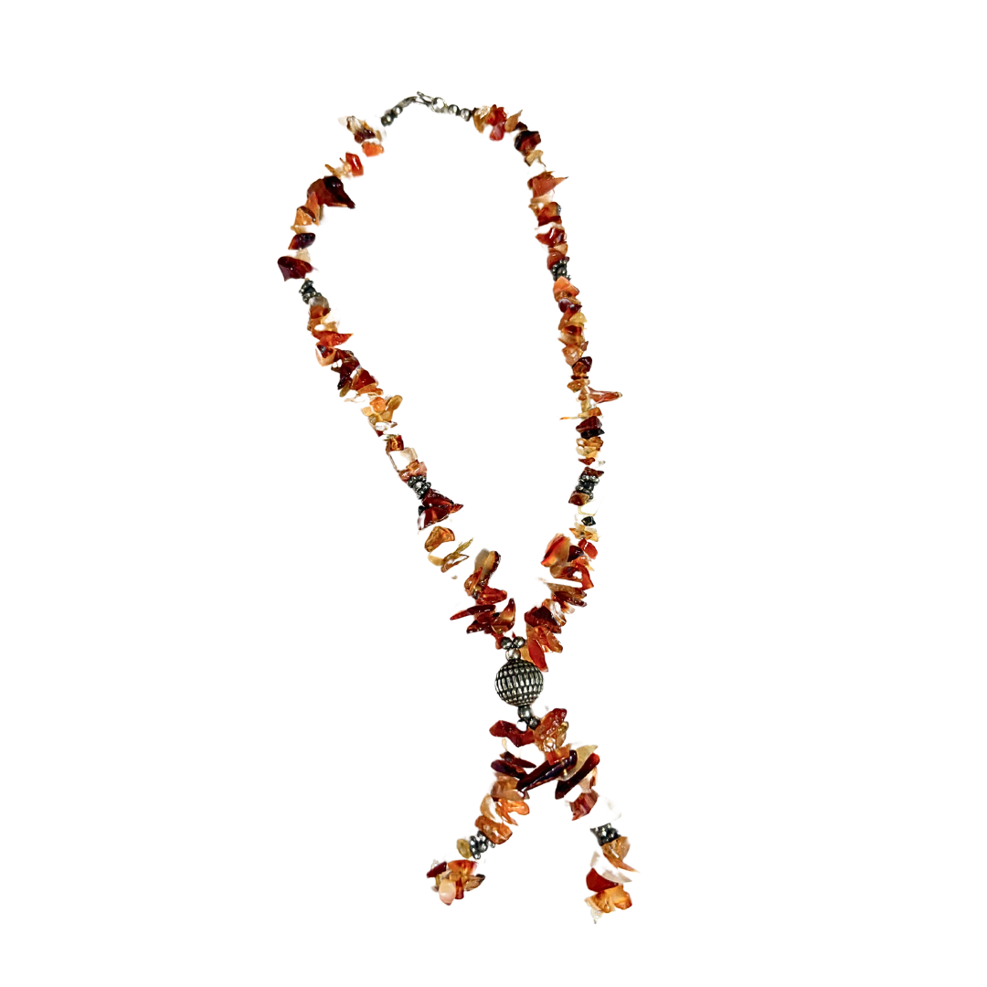 Brown carnelian chip lariat necklace with silver charms. Has an S-clasp closure.