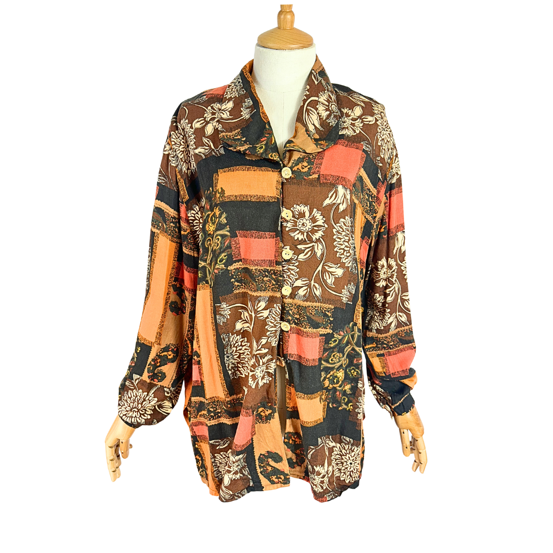 Brown, black, and orange vintage floral longsleeve shirt. Has a front button closure.