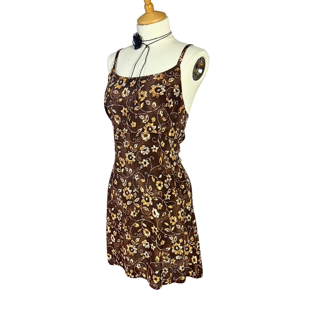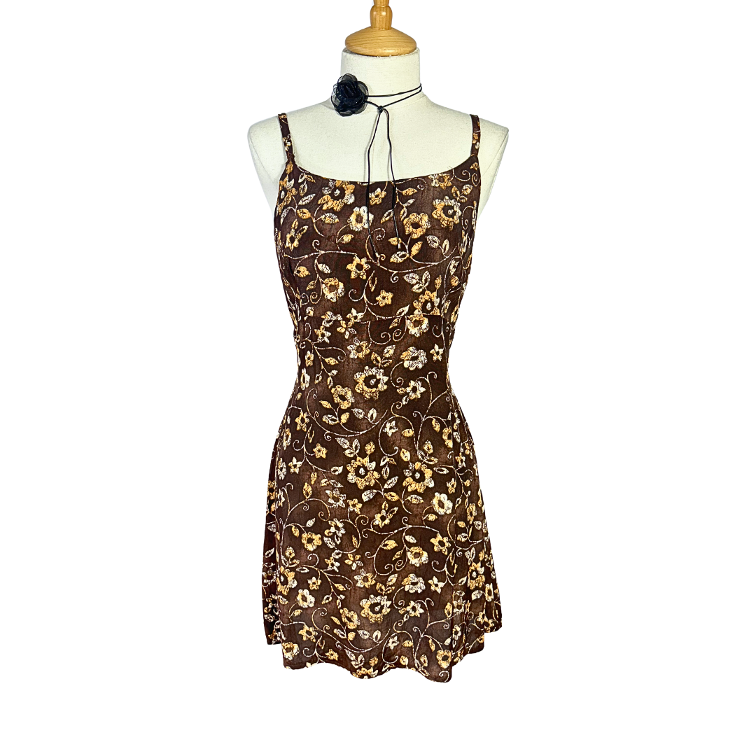 Brown 90s floral spaghetti strap dress. Has a zip closure at the back. Made in the UK.