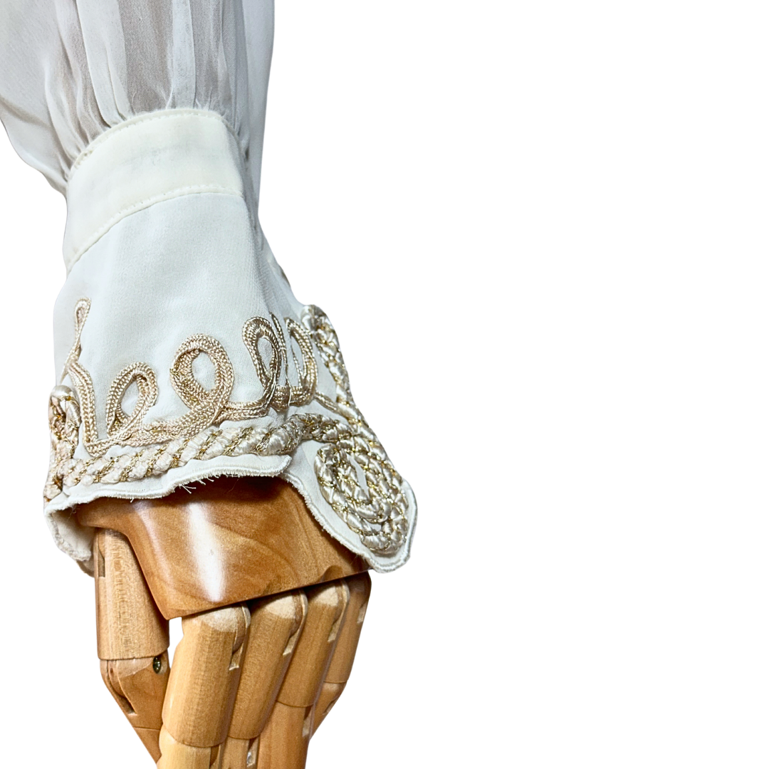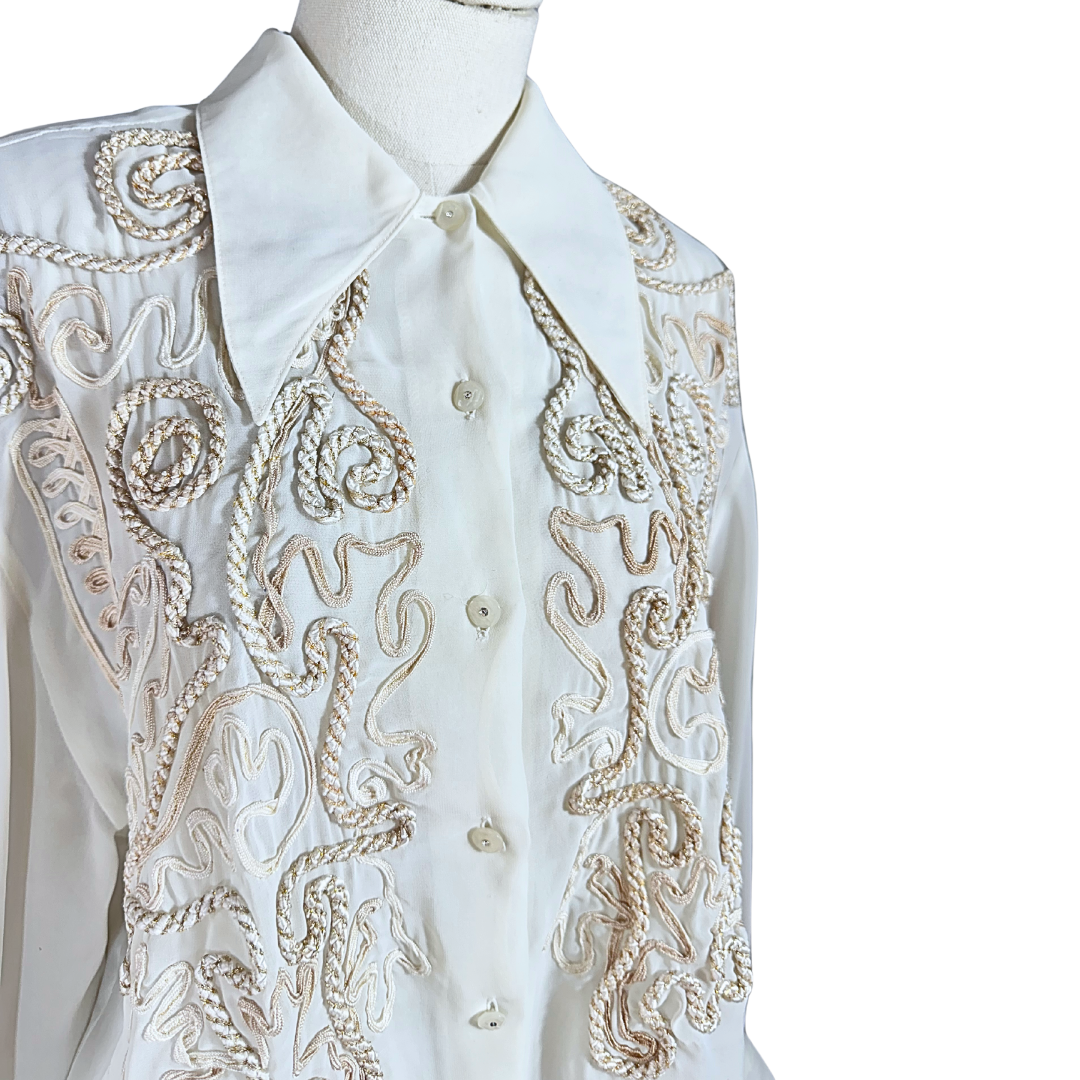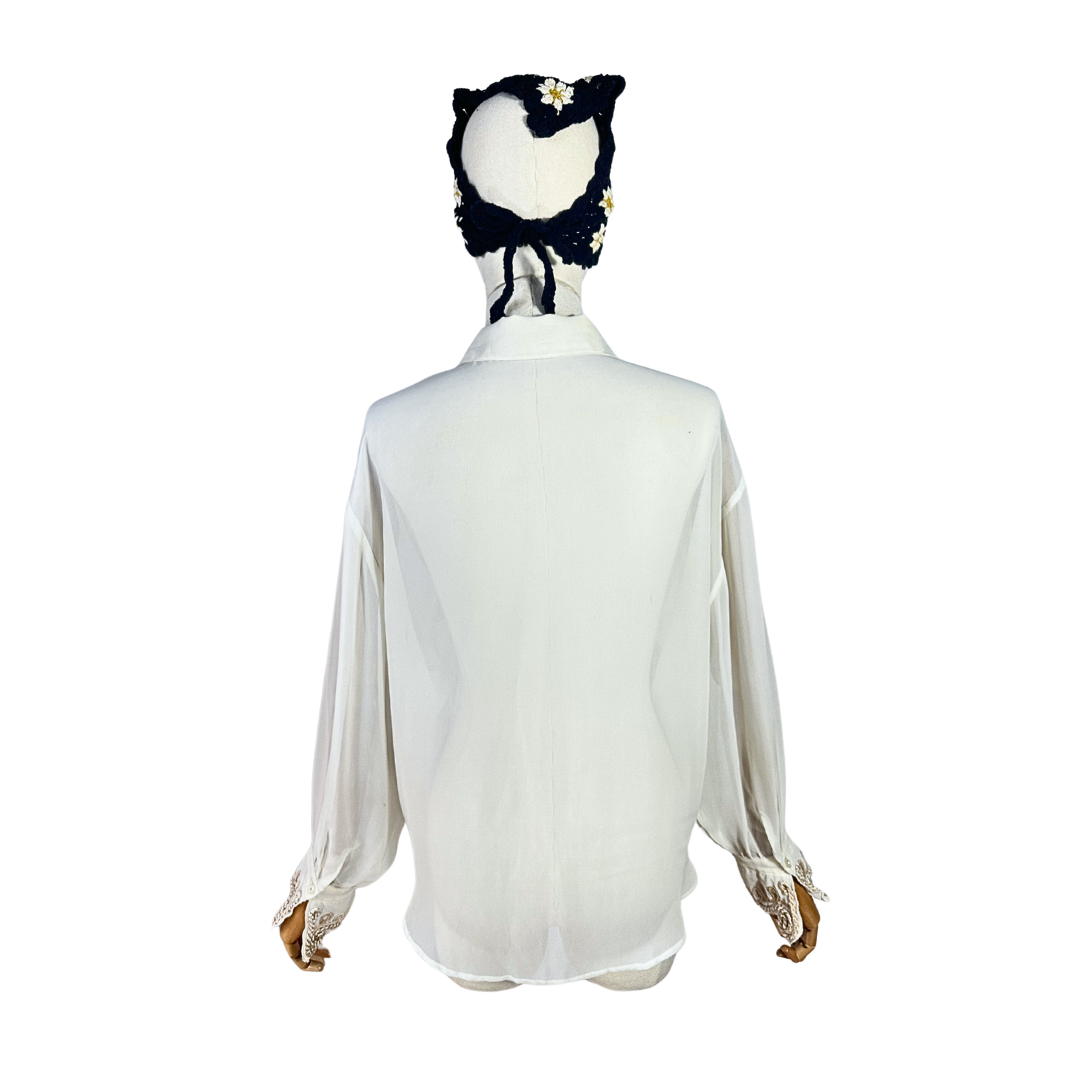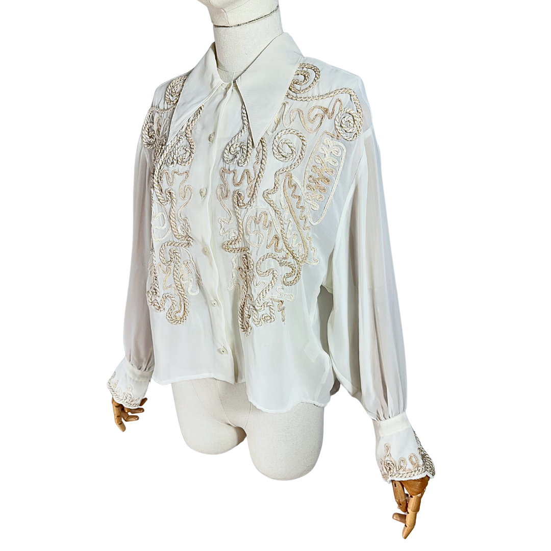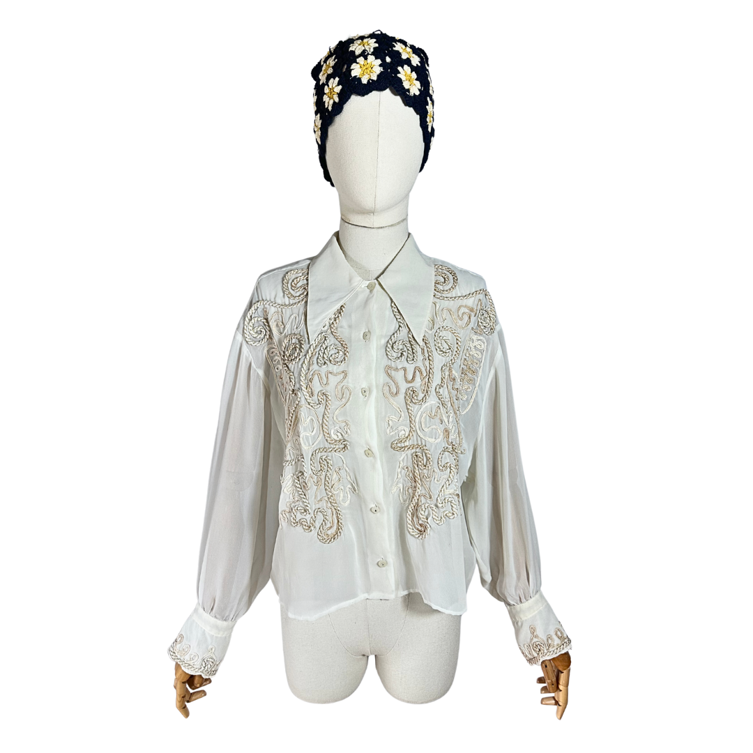 Cream vintage embroidered sheer longsleeve shirt. Chiffon-like fabric. Has a dagger collar.