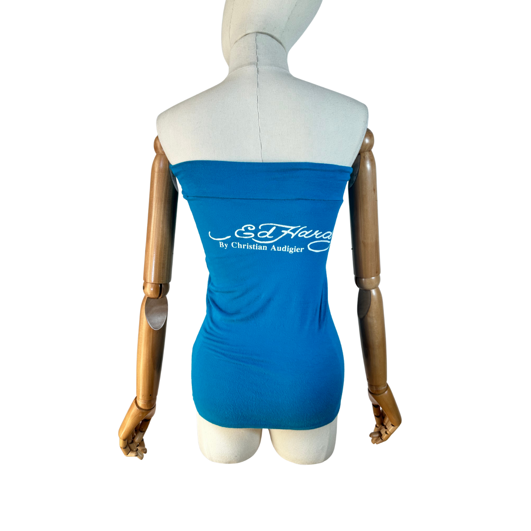 Ed Hardy boob-tube fitted top with print on the front and logo at the back. Has a skull and heart graphic print with rhinestones.