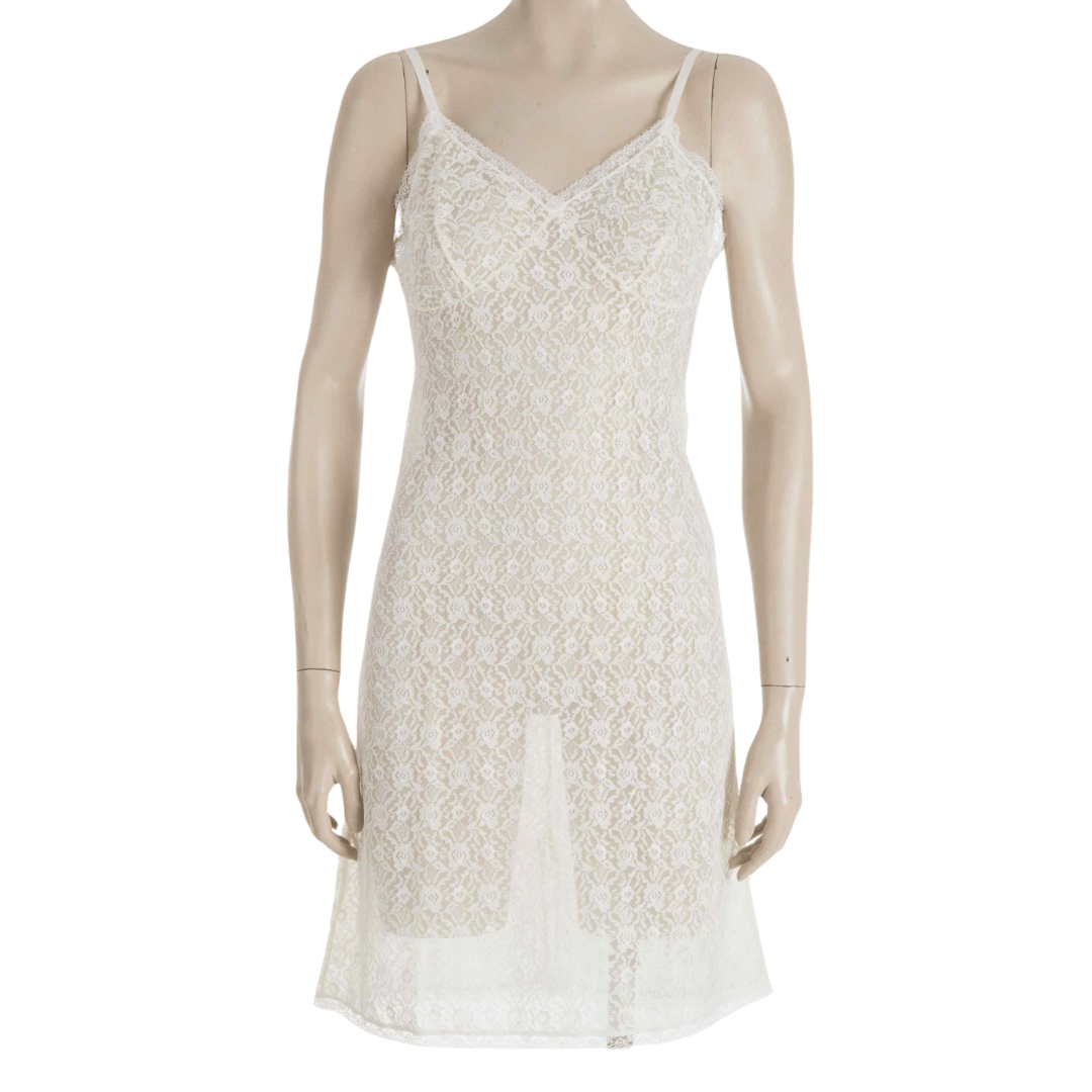 Cream floral lace slip dress. Lined with light yellow mesh fabric. Semi-sheer. Has adjustable straps.