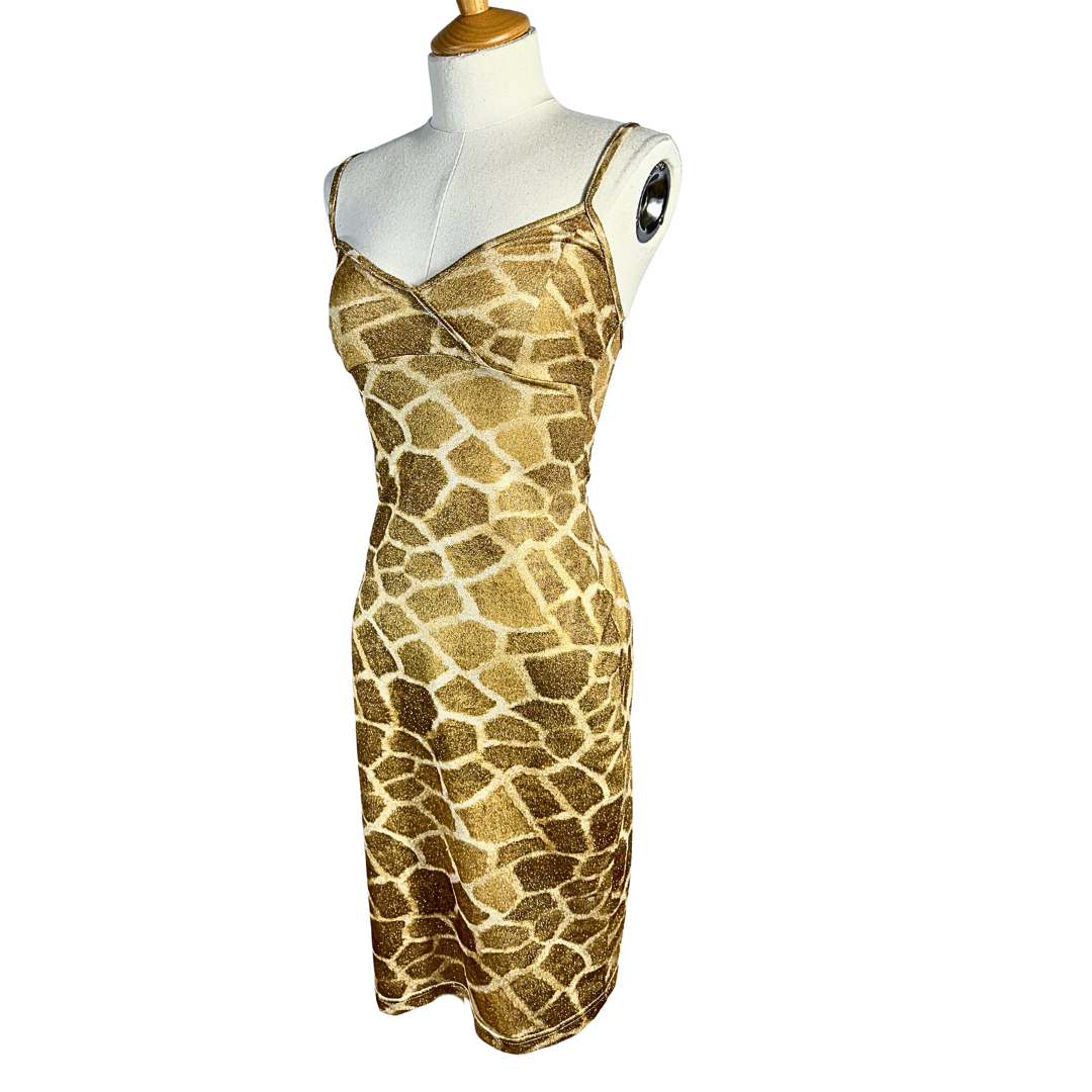Brown and cream glittery giraffe print spaghetti strap bodycon dress. Fabric has some stretch to it.