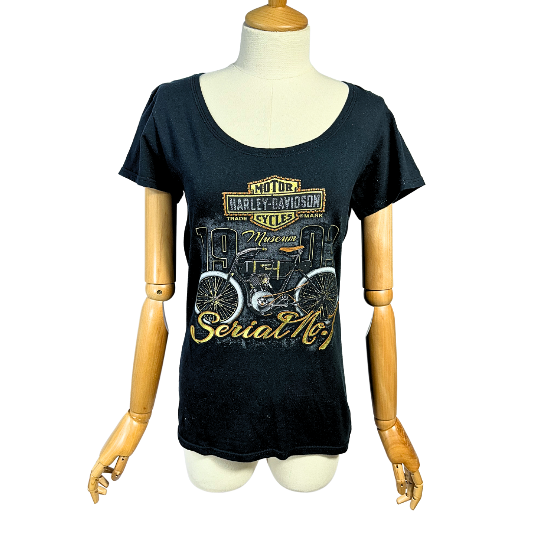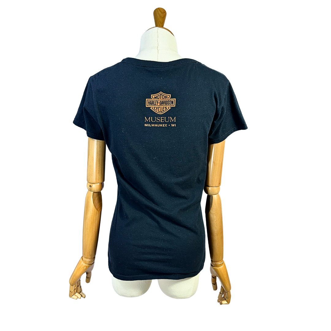 Black Harley Davidson Museum Milwaukee graphic print t-shirt. Has a scoop neckline and embellished design on the front. Print on the front and back.