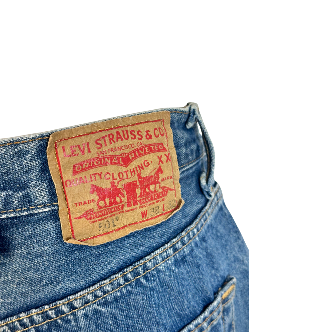 Blue Levi's 501 button-fly denim jeans. Has a button closure, belt loops, and pockets. Regular-rise and straight cut.