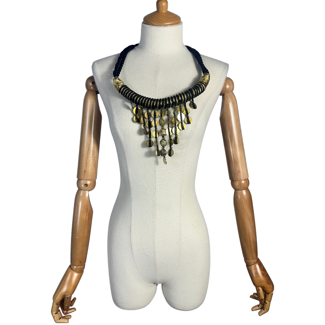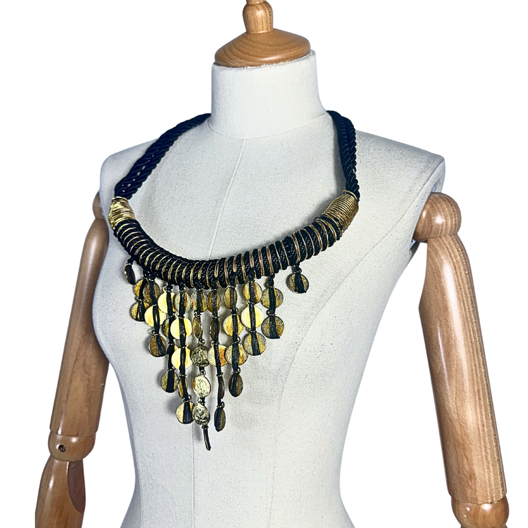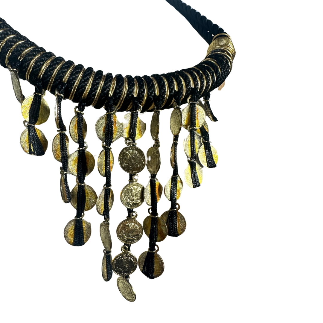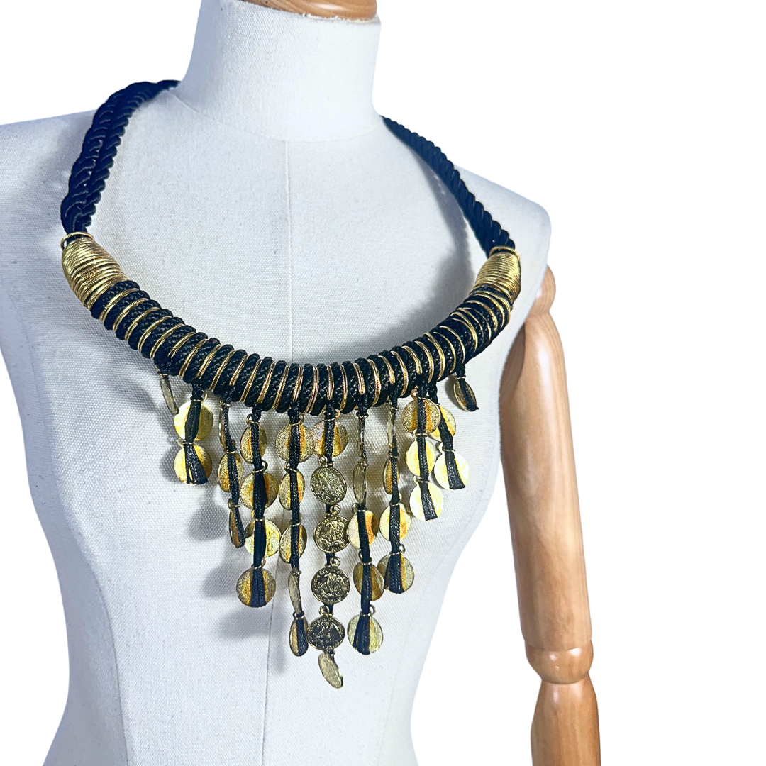 Black and gold statement necklace with gold-tone coins and rope details. Has a hook closure.