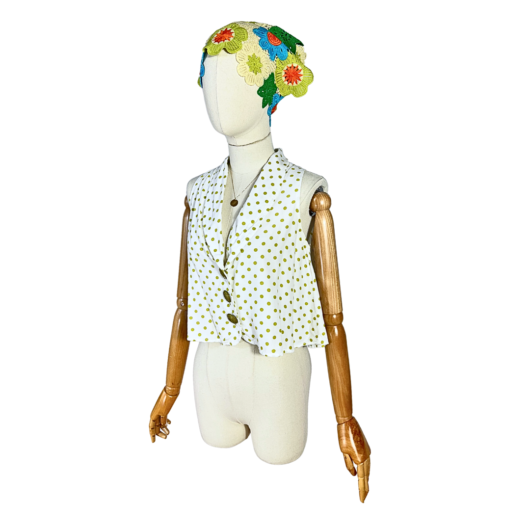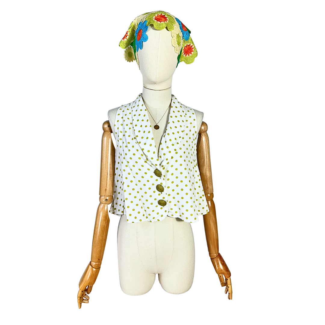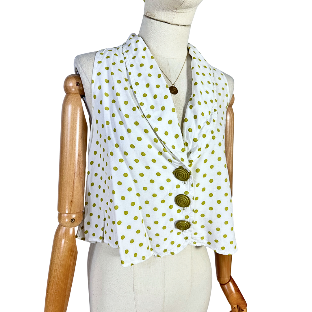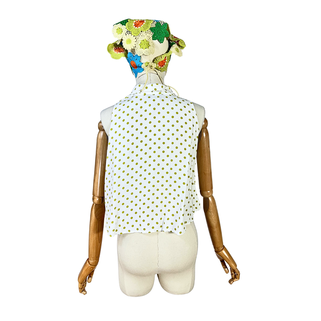 White and green sleeveless polka dot cropped top. Has a button-down closure. Loose-fit. Made in USA.