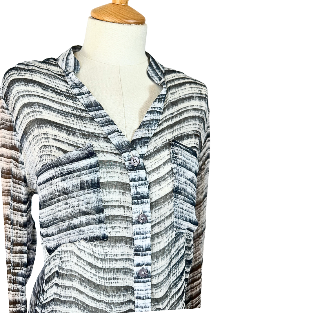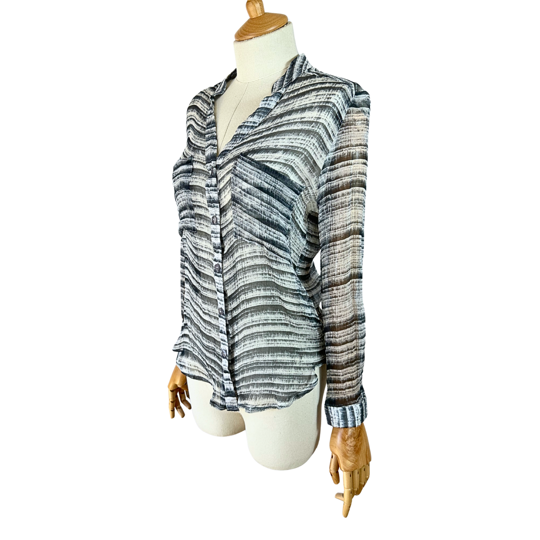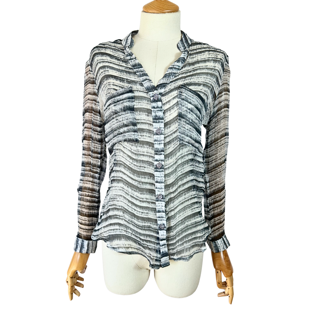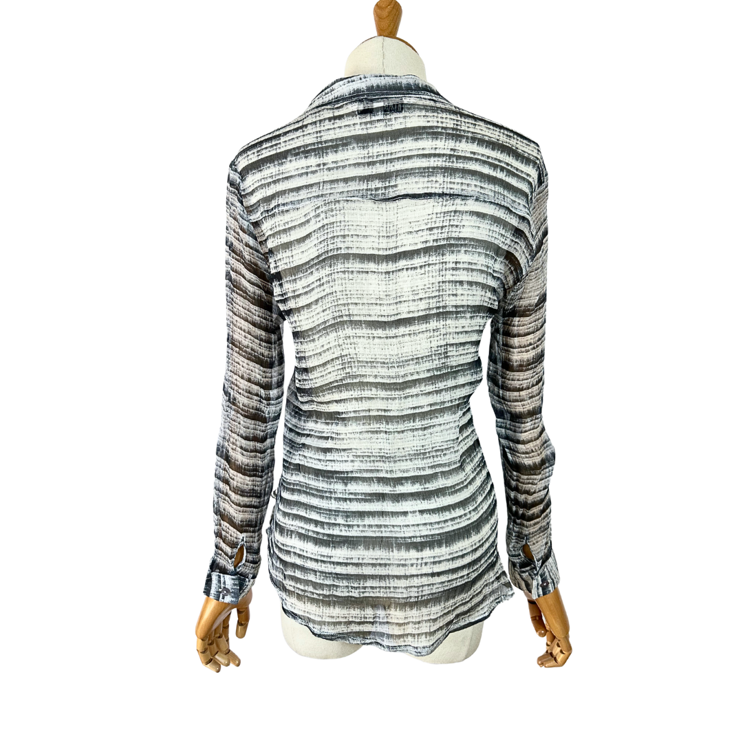 Grey and white Pringle of Scotland sheer striped longsleeve shirt.