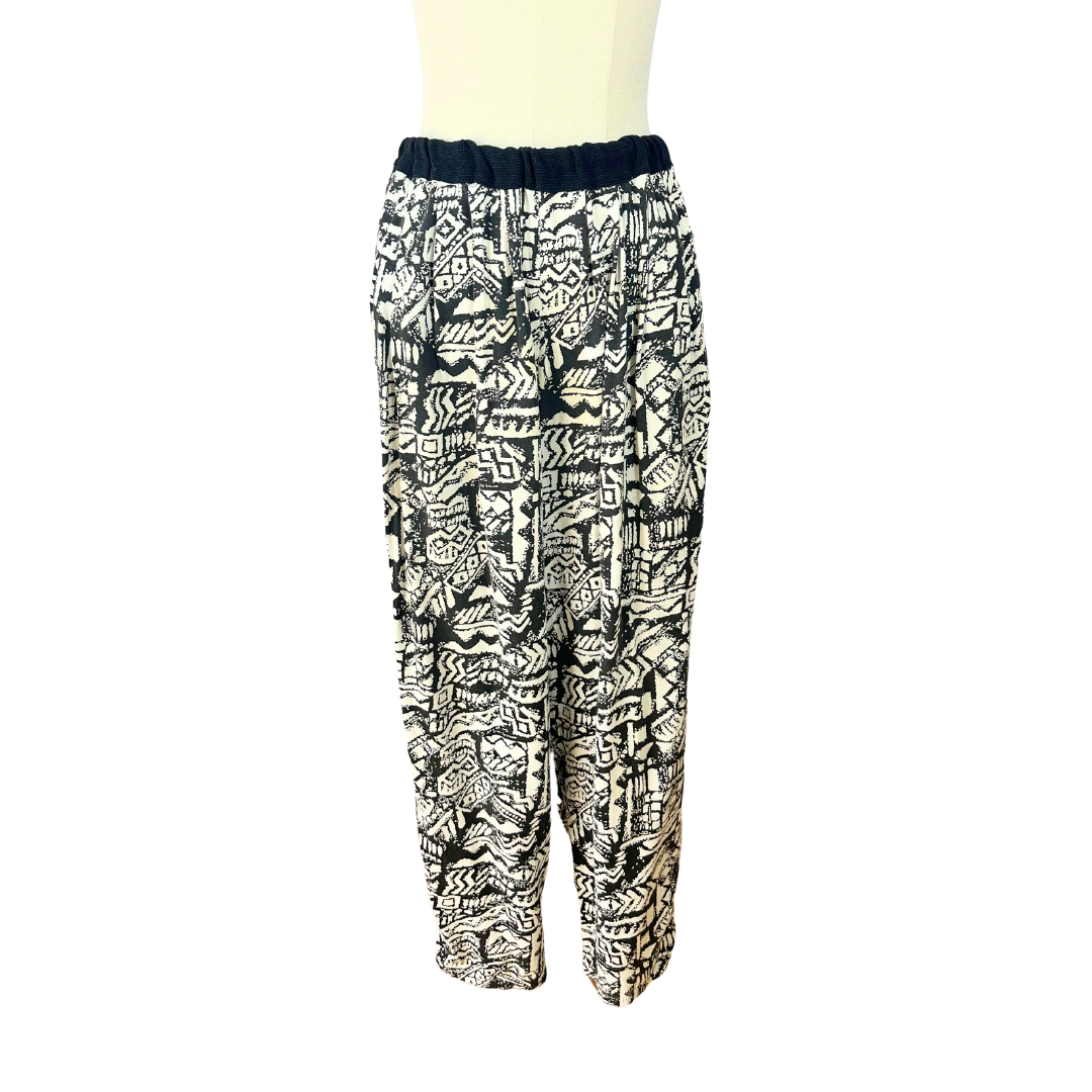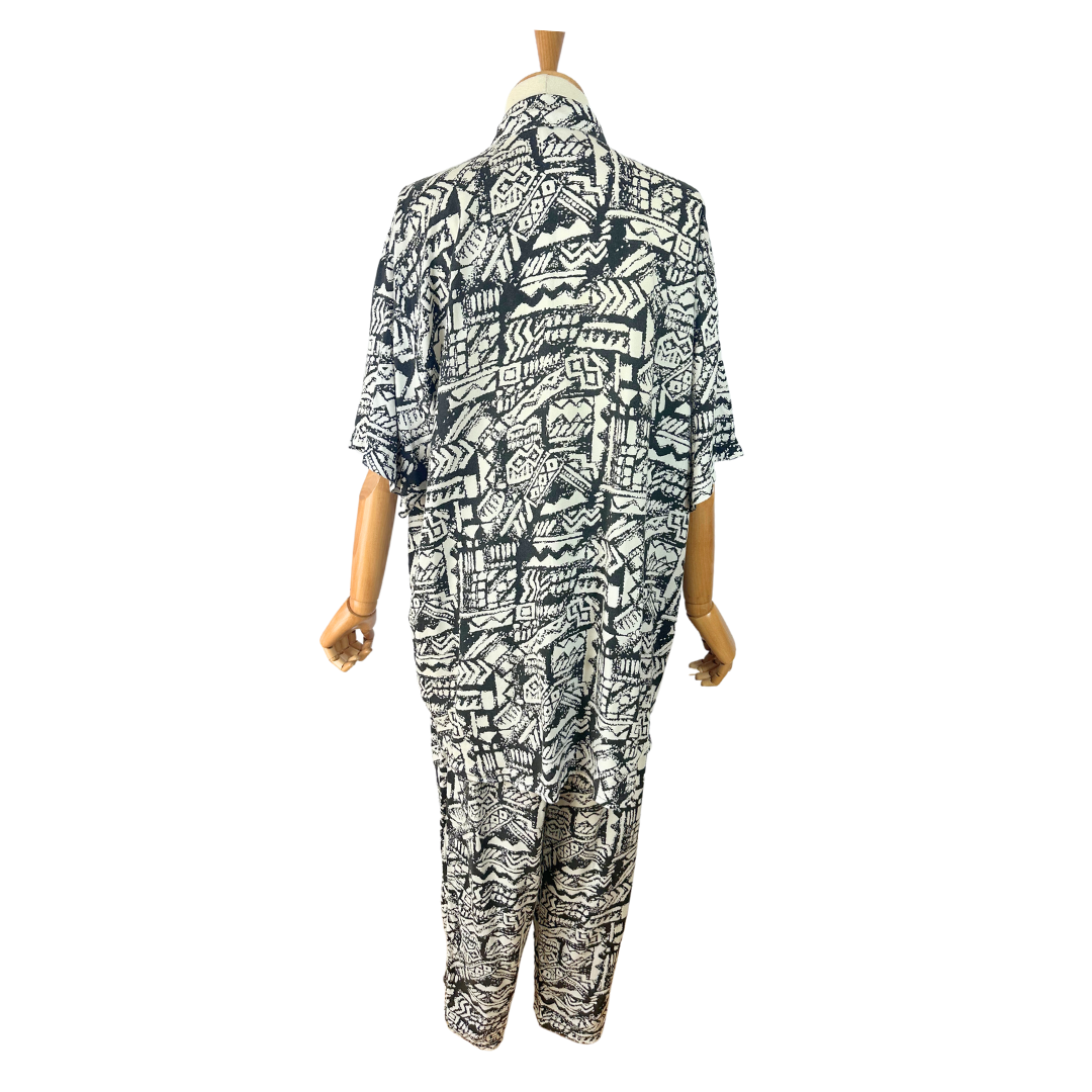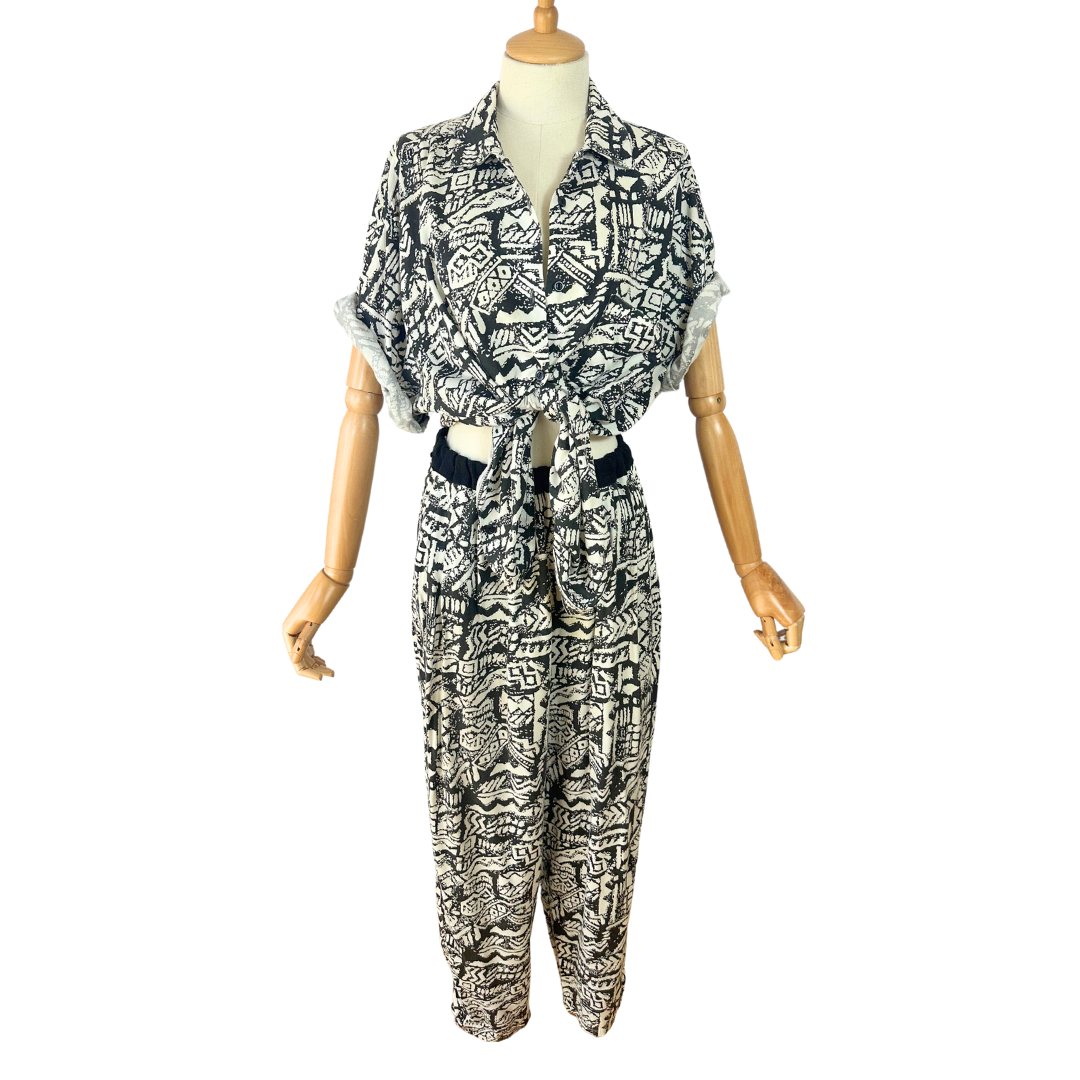 Vintage black and white monochrome shirt and pants set. Printed shortsleeve shirt has front button closure. Elasticated pants are a relaxed fit. High to mid-rise.