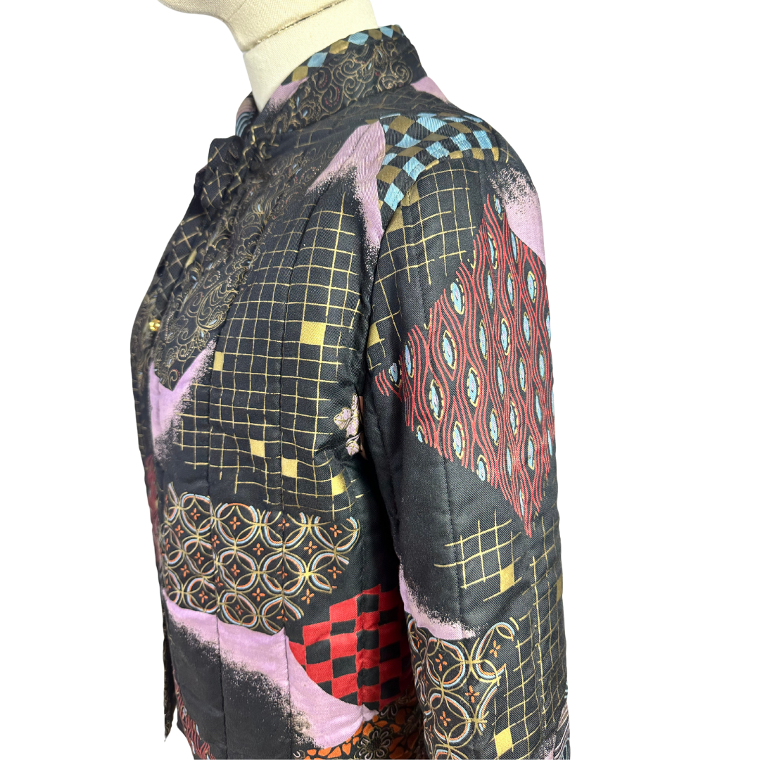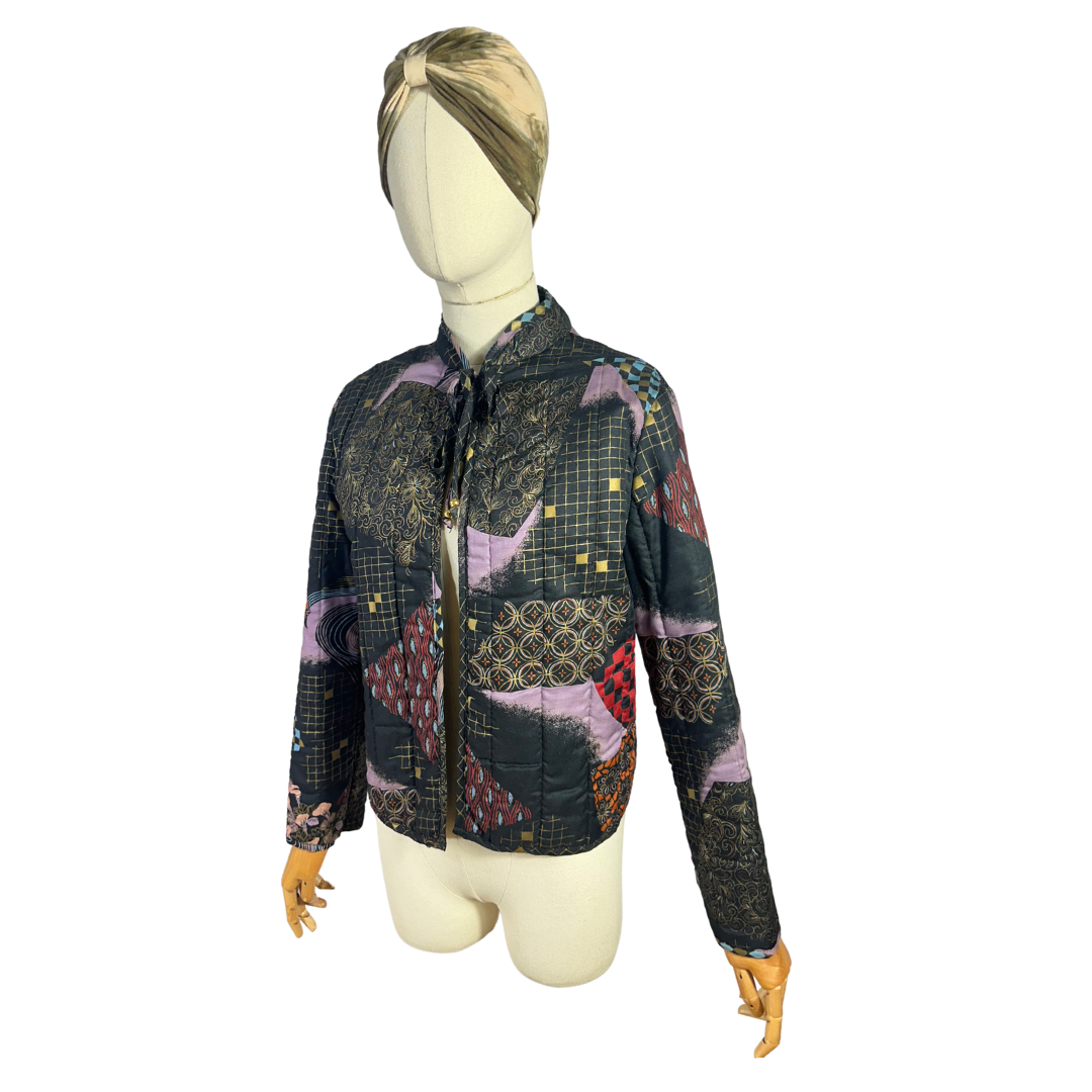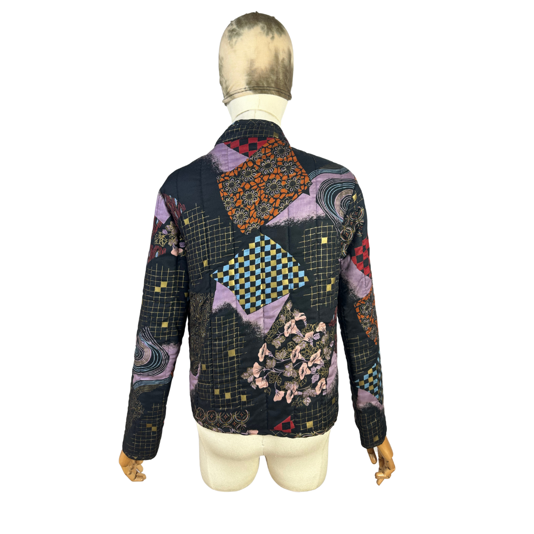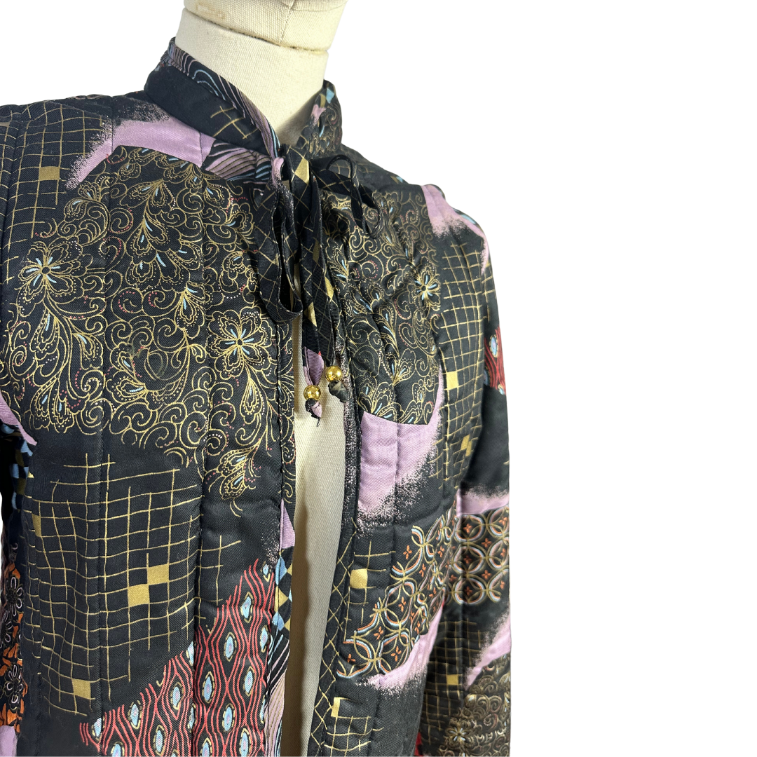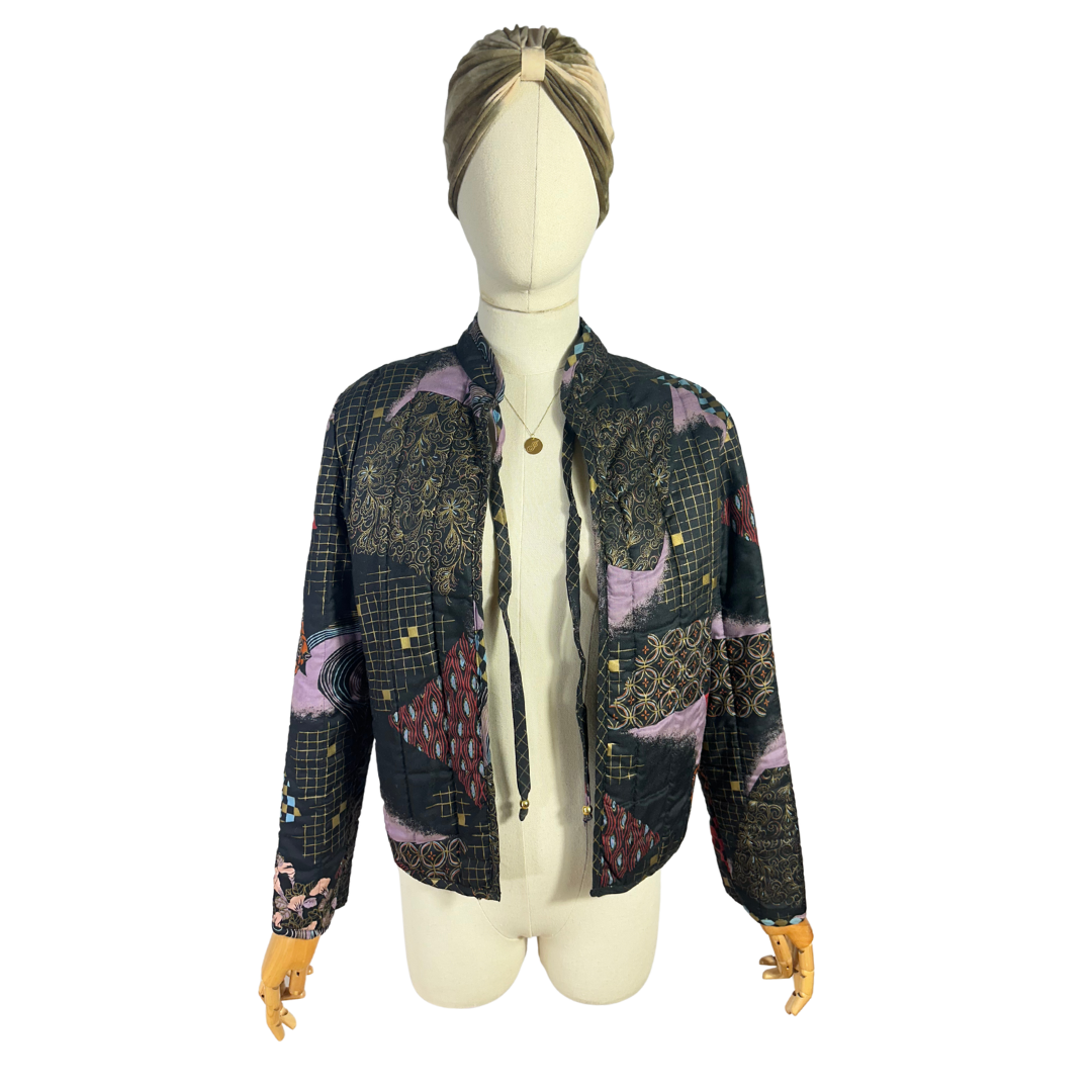 Black, red, blue, and gold vintage Mandala and checkered quilted jacket. Has a front tie closure around the neck.