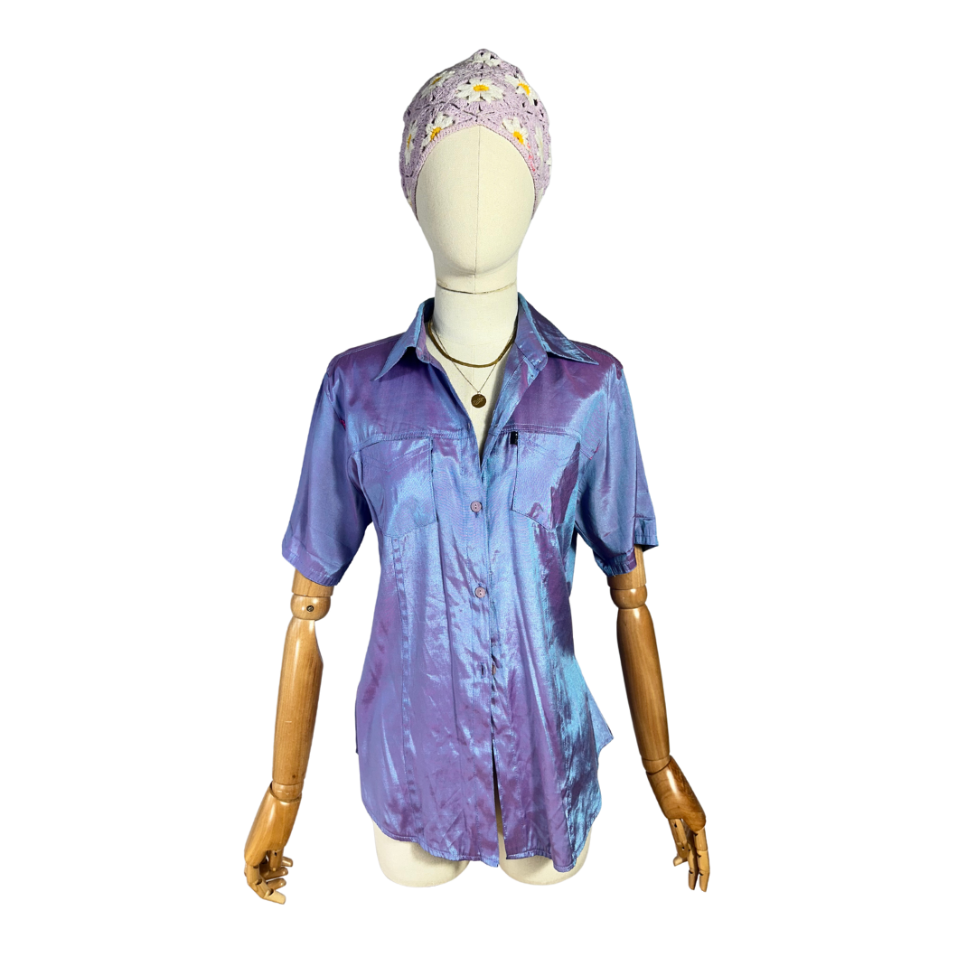 Purple holographic shortsleeve shirt. Has two chest pockets.