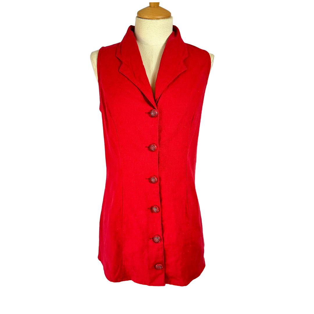 Red 90s sleeveless top with collar. Has a button closure and lace-up detail at the back.