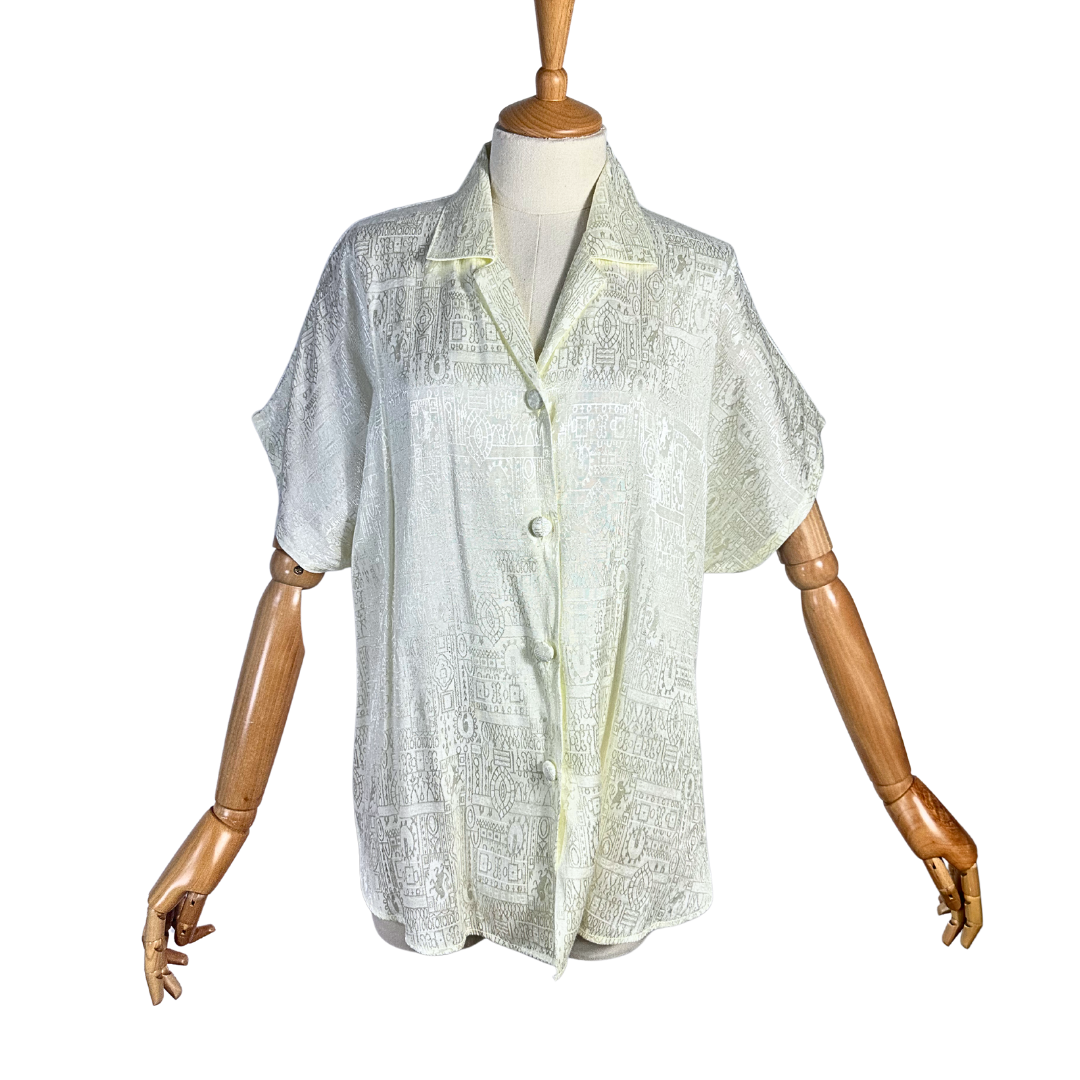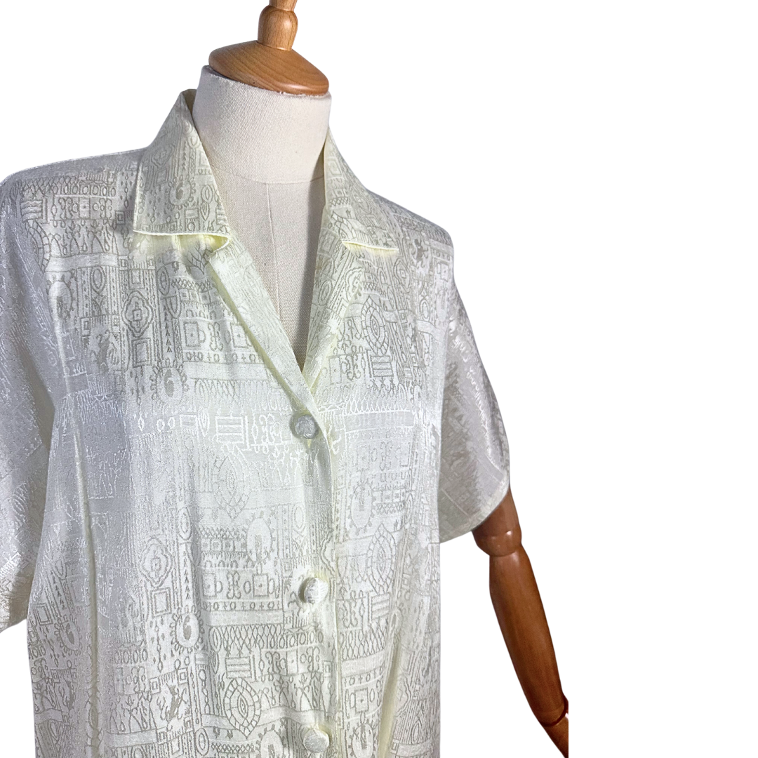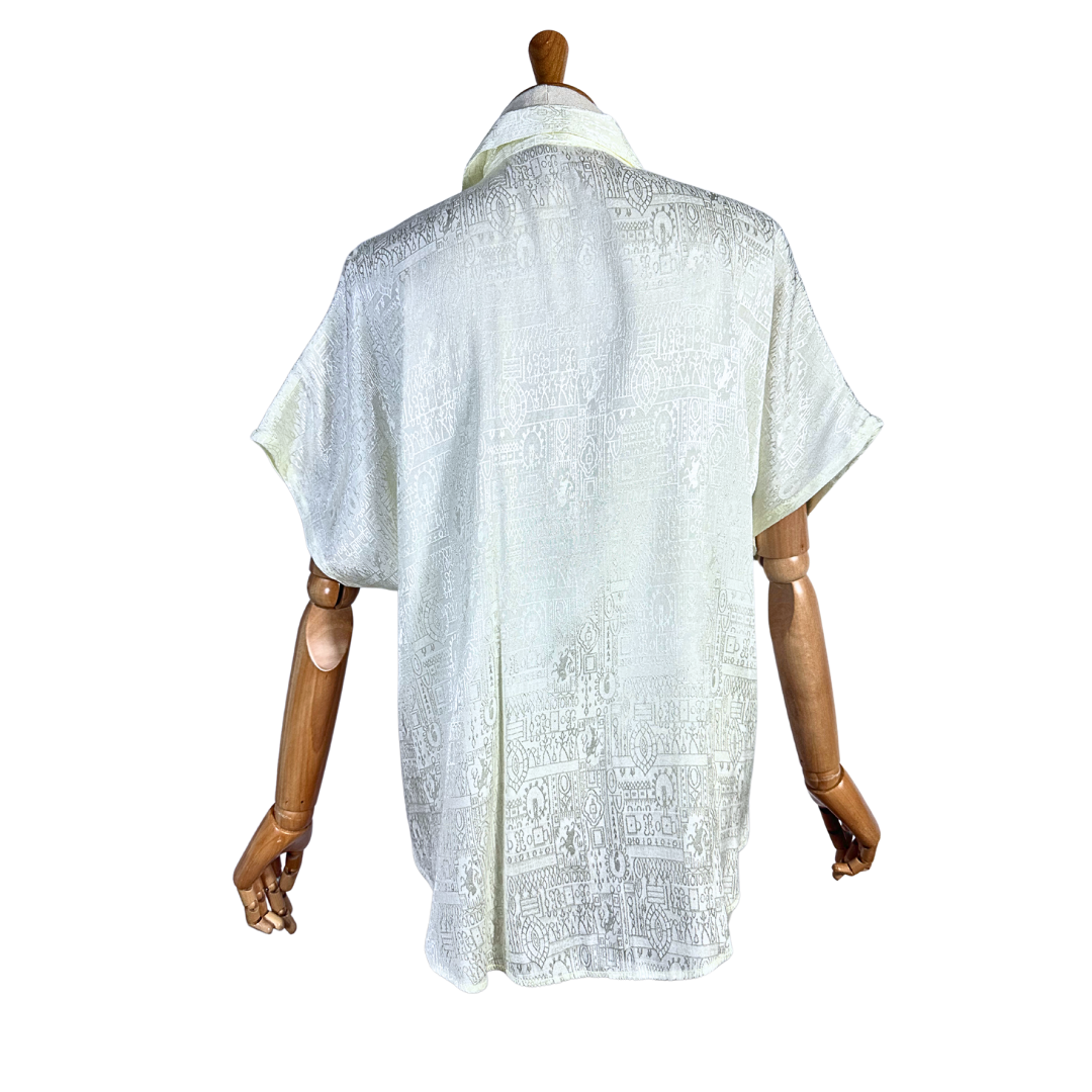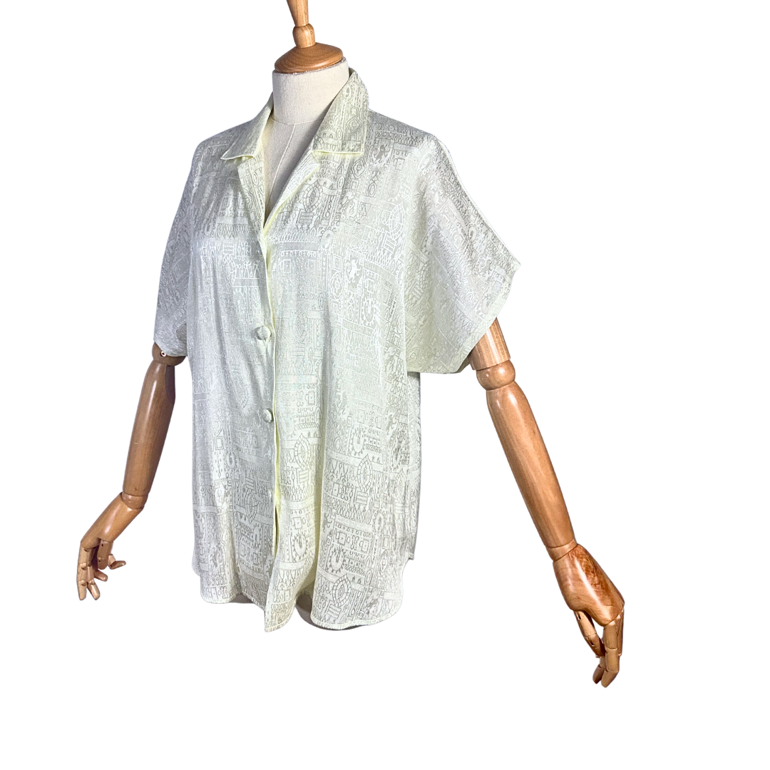 Cream vintage shortsleeve shirt with tribal or oriental design.