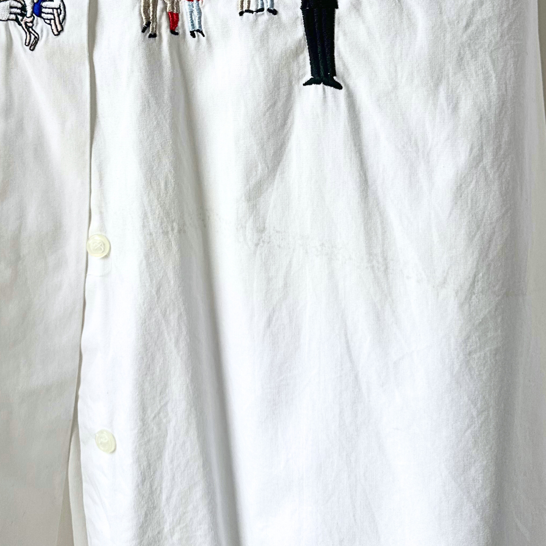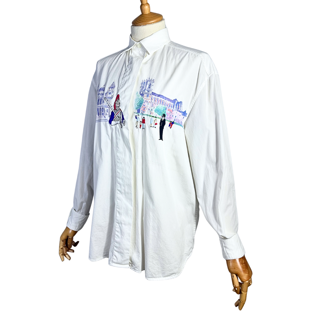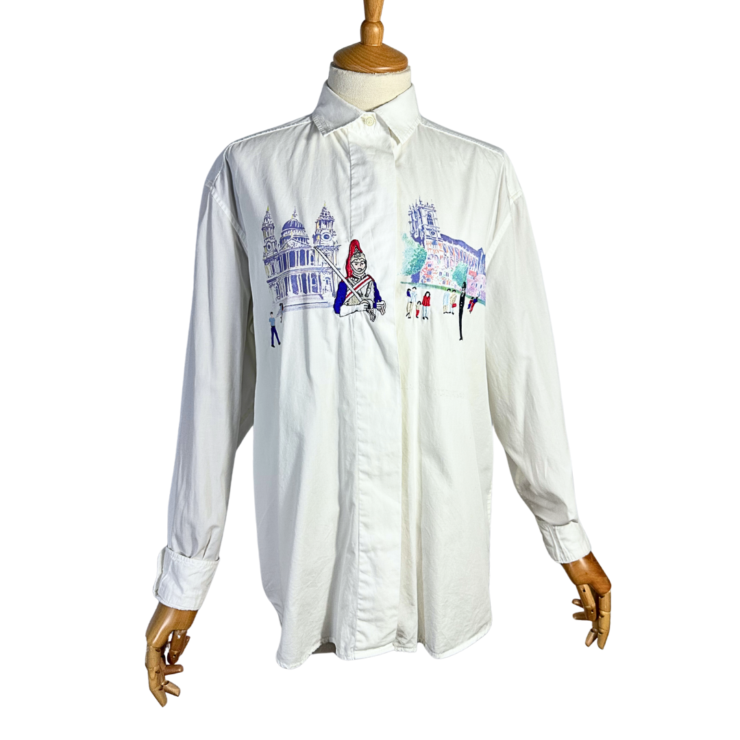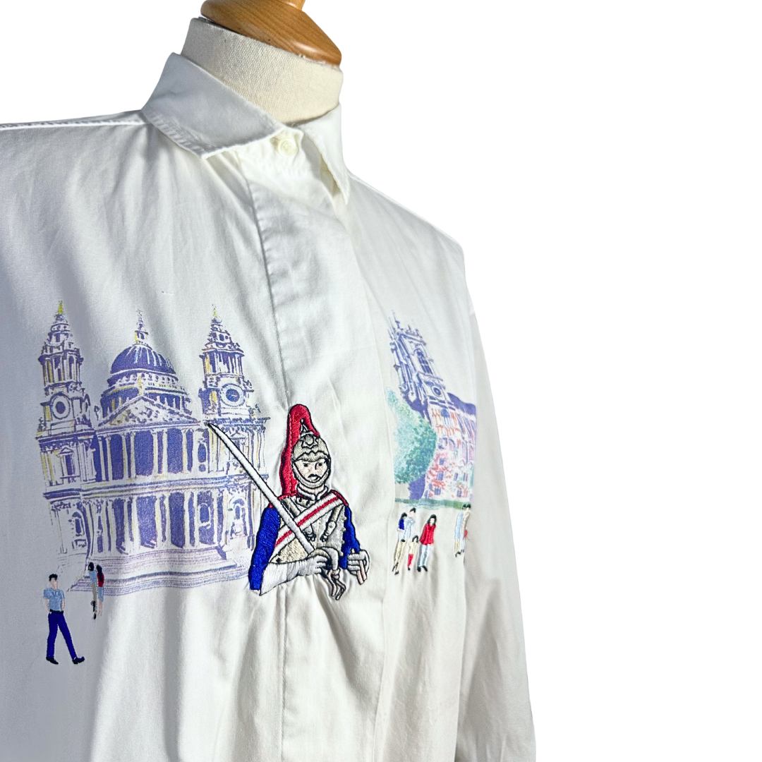White vintage embroidered and printed longsleeve shirt. Has a London element to it.