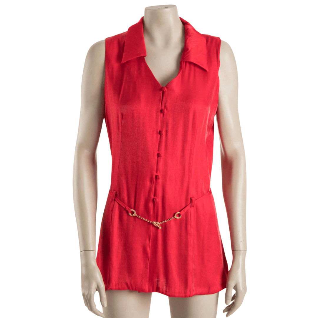 Red sleeveless button-up collared top with fabric belt and gold metal detail.