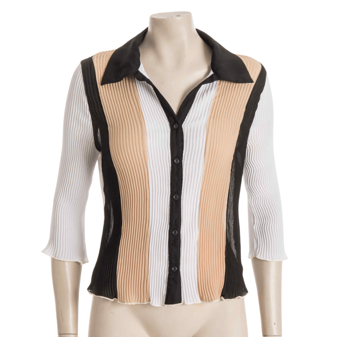 Striped three-quarter sleeve plisse shirt in white, black and light brown.