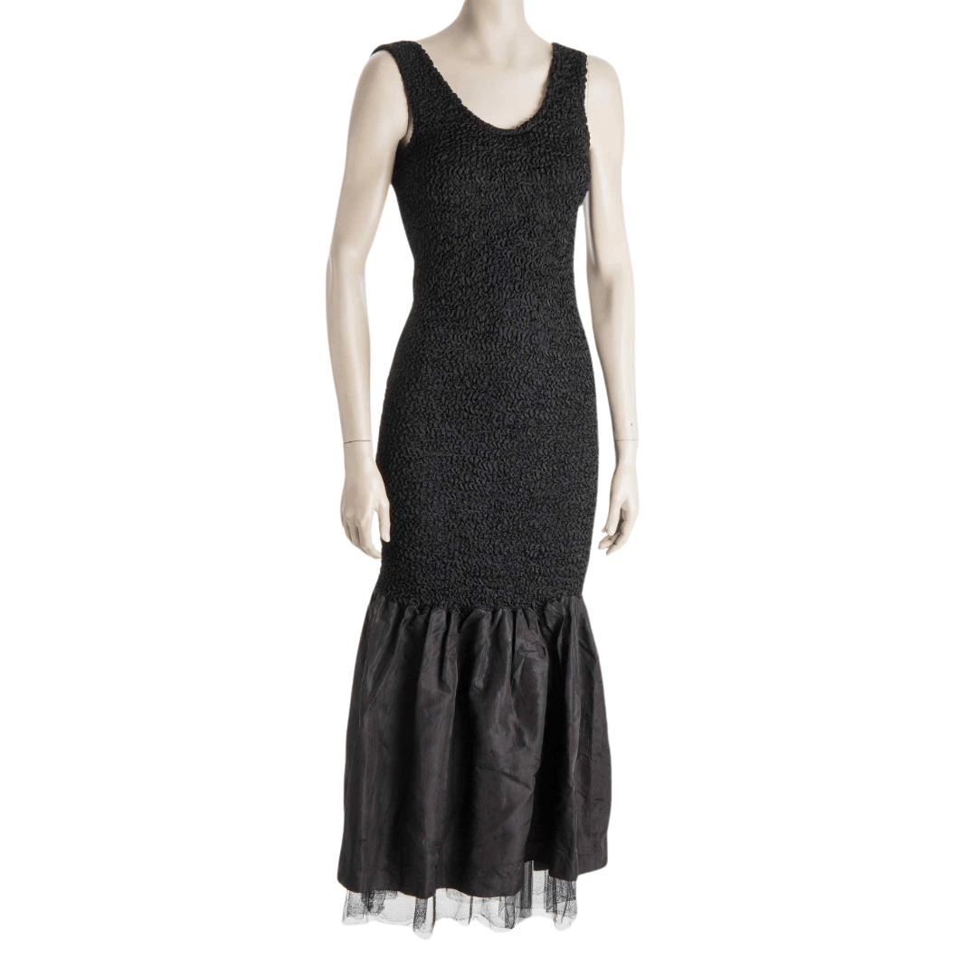 Black textured mermaid-style bodycon maxi dress. Low-back. Stretchy fabric.