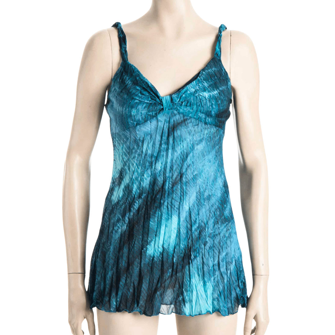 Blue tie-dye spaghetti strap pleated tunic with sheer bodice and lined bust.