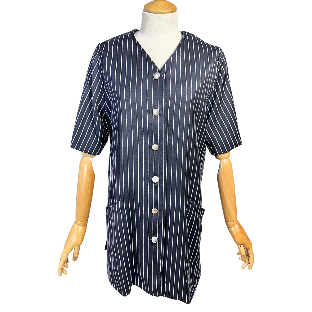 Navy and white vintage Escada by Margaretha Ley pinstripe shortsleeve jacket. Lined. Has a front button closure and two front pockets. Made in Germany.