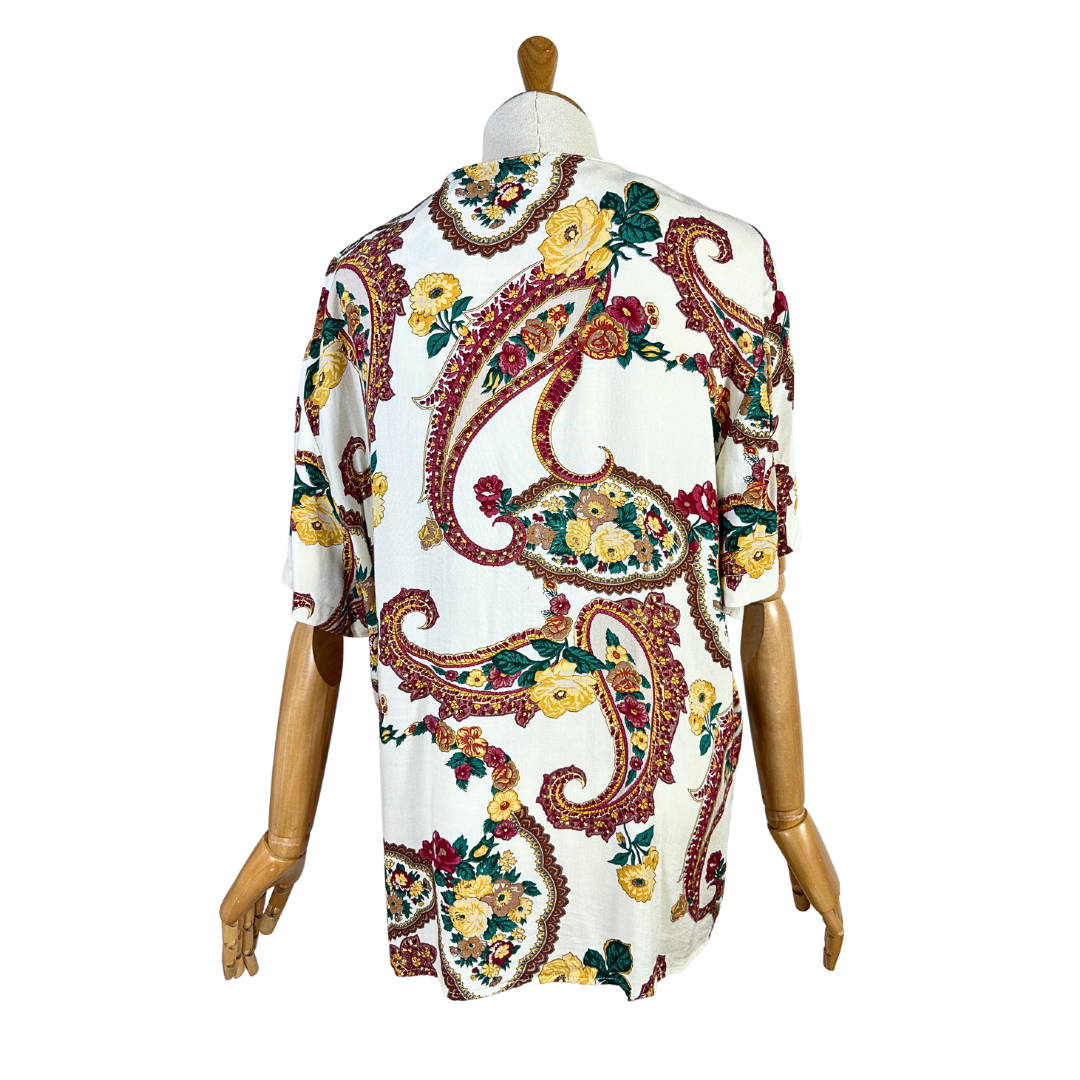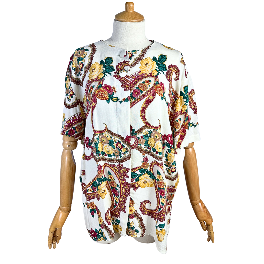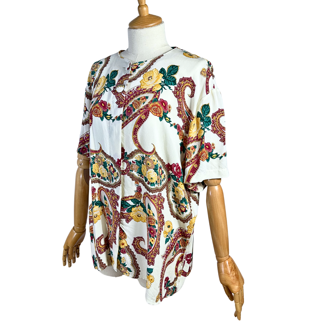 Cream, yellow, red, and green vintage floral button-down shortsleeve shirt.