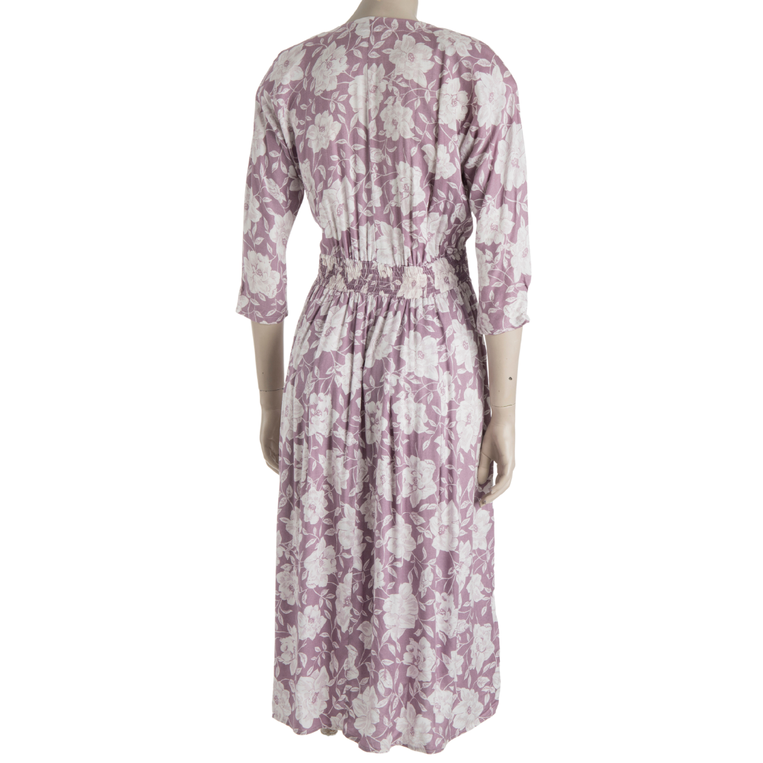 White, mauve, and taupe vintage floral v-neck three-quarter sleeve maxi dress with Dolman sleeve and elasticated back. Has shoulder pads.