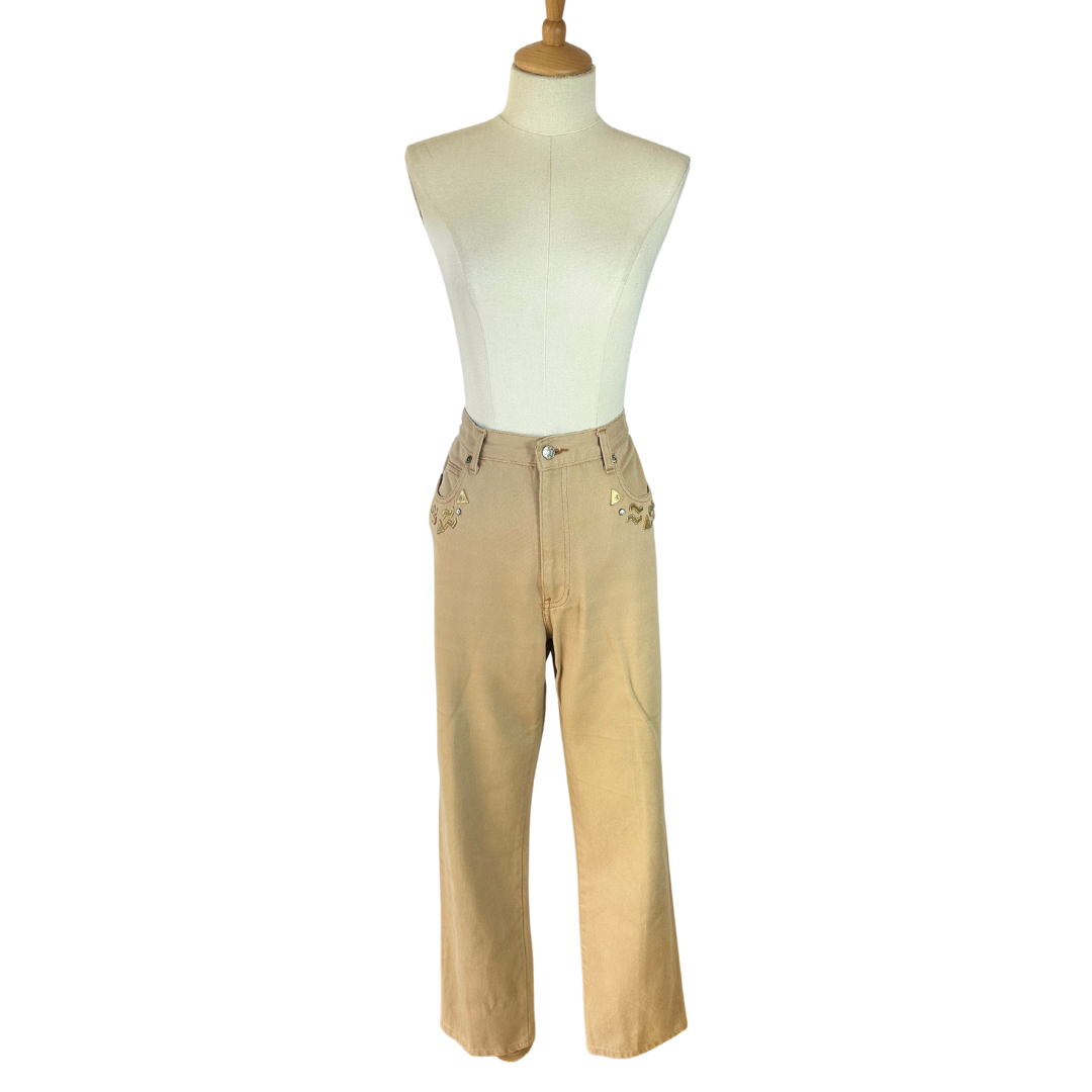 Tan vintage high-waist tapered denim pants with gold and rhinestone embellishment. Has a button and zip closure, belt loops, and pockets.