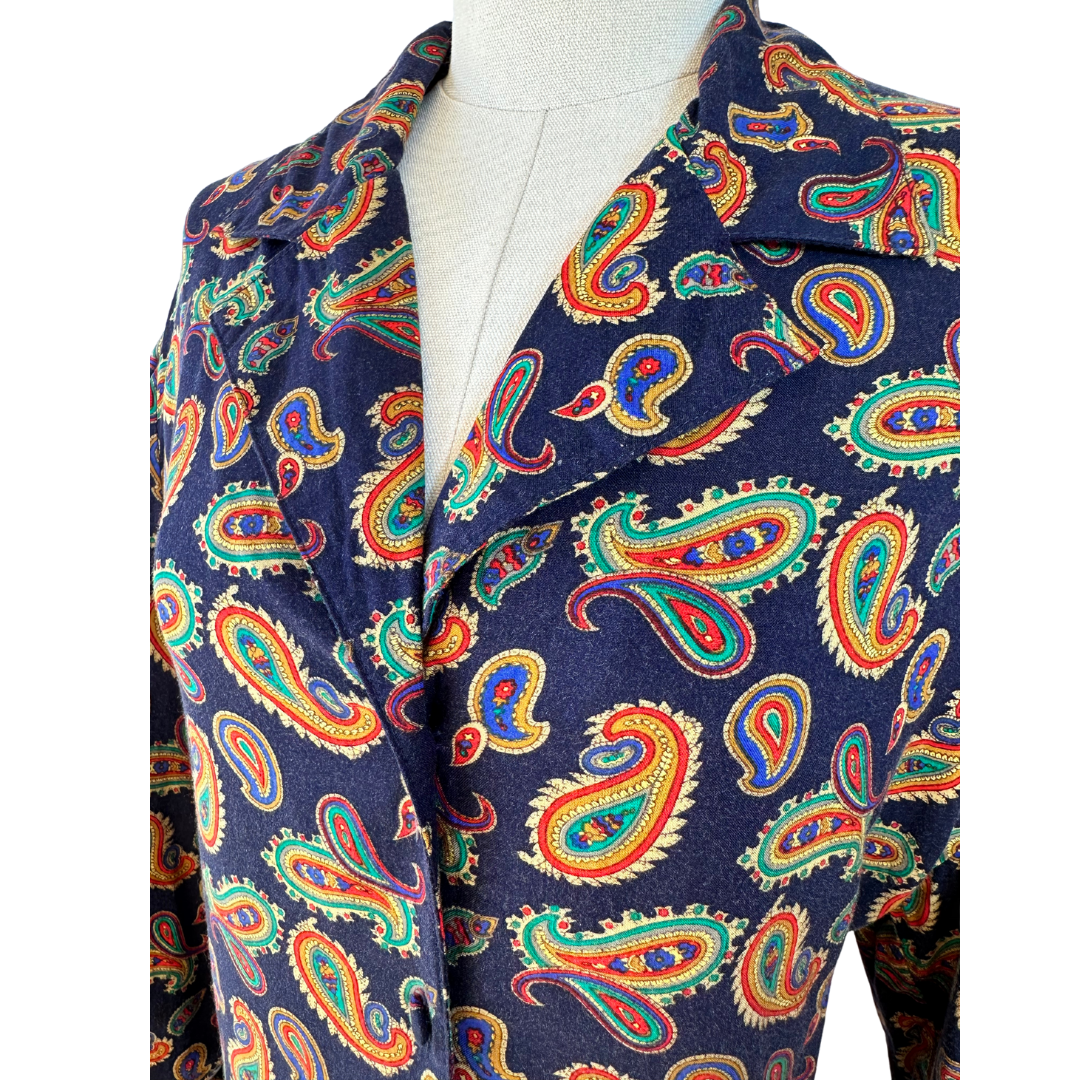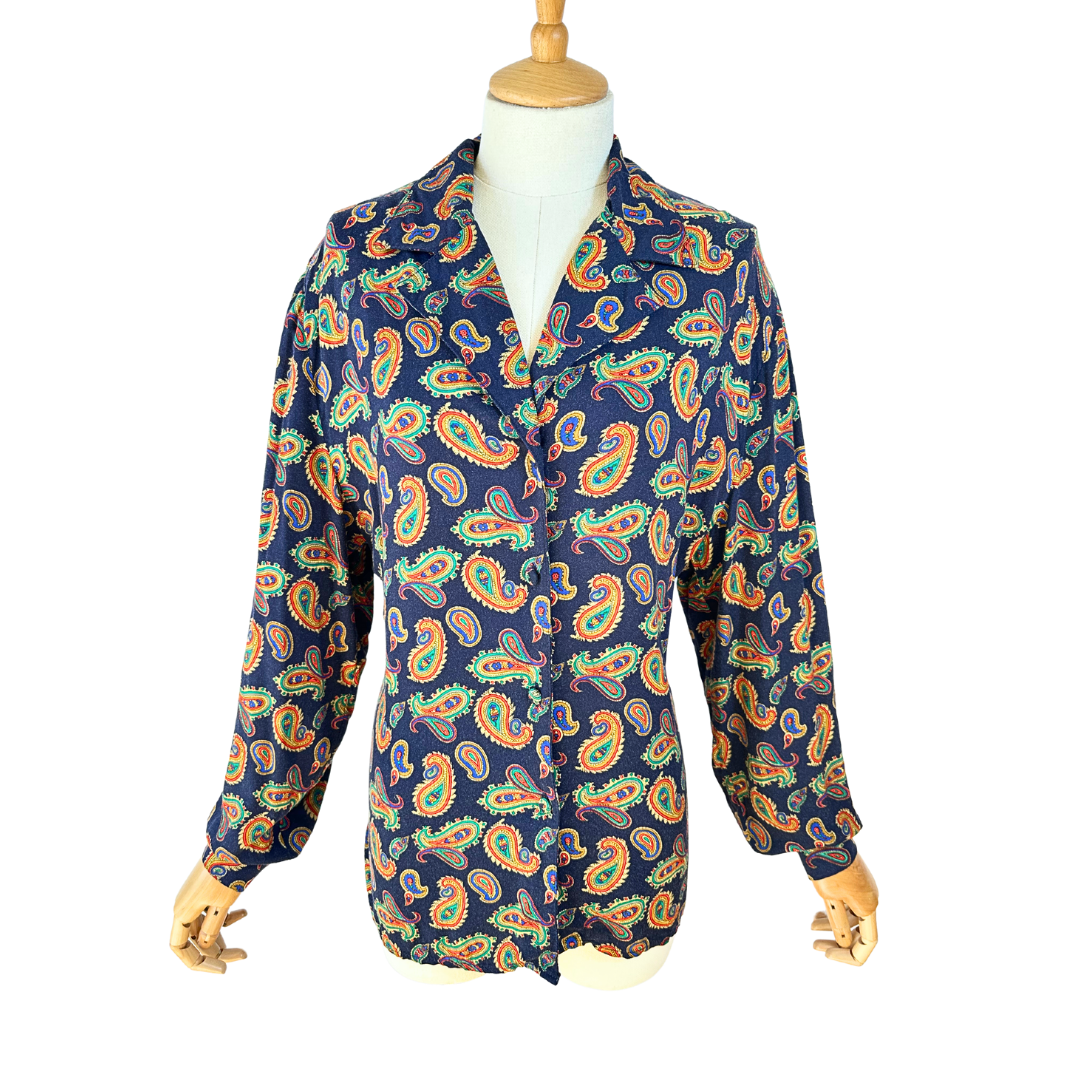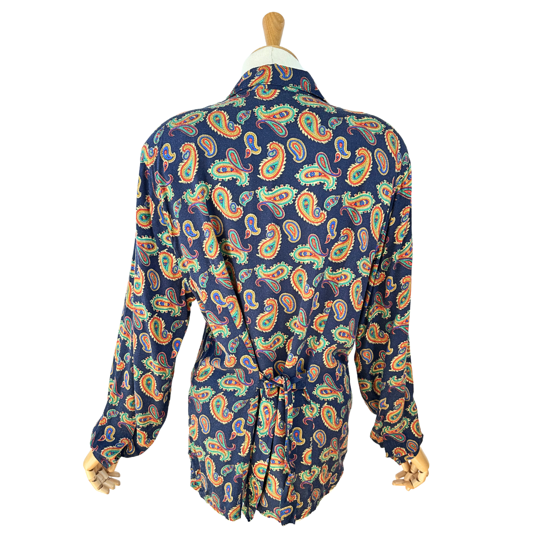 Blue vintage paisley print longsleeve shirt with shoulder pads and fabric buttons.
