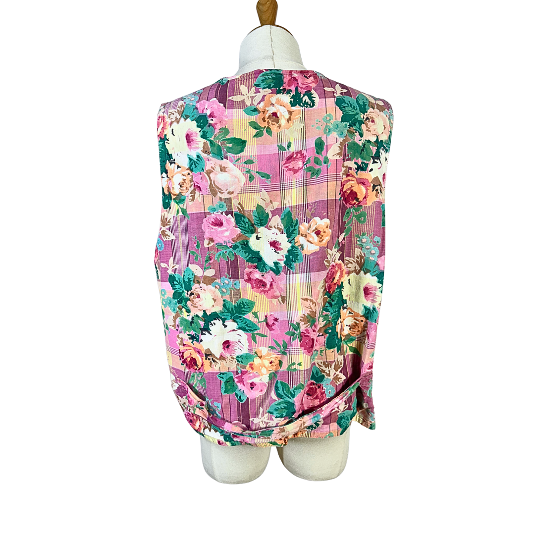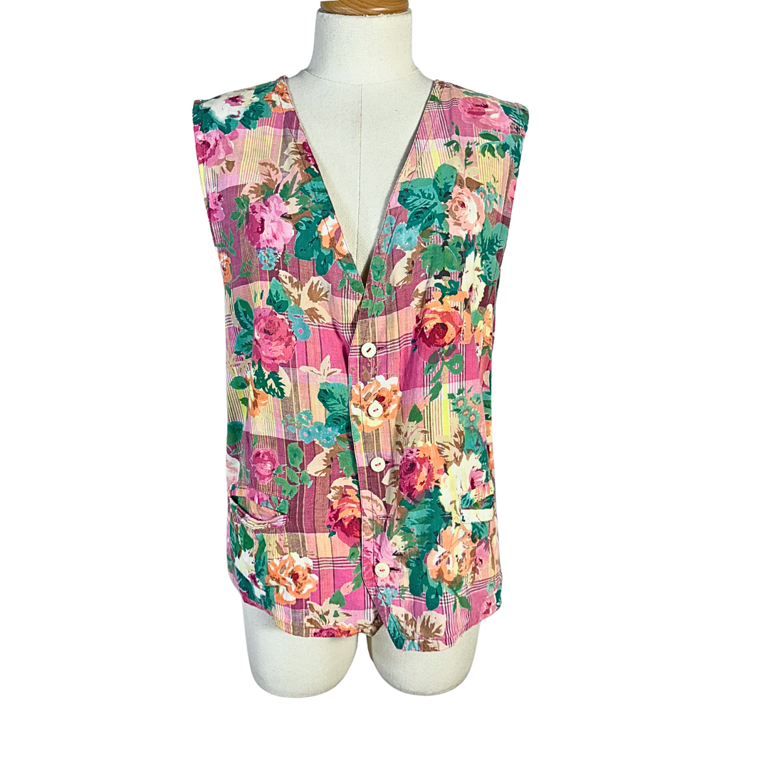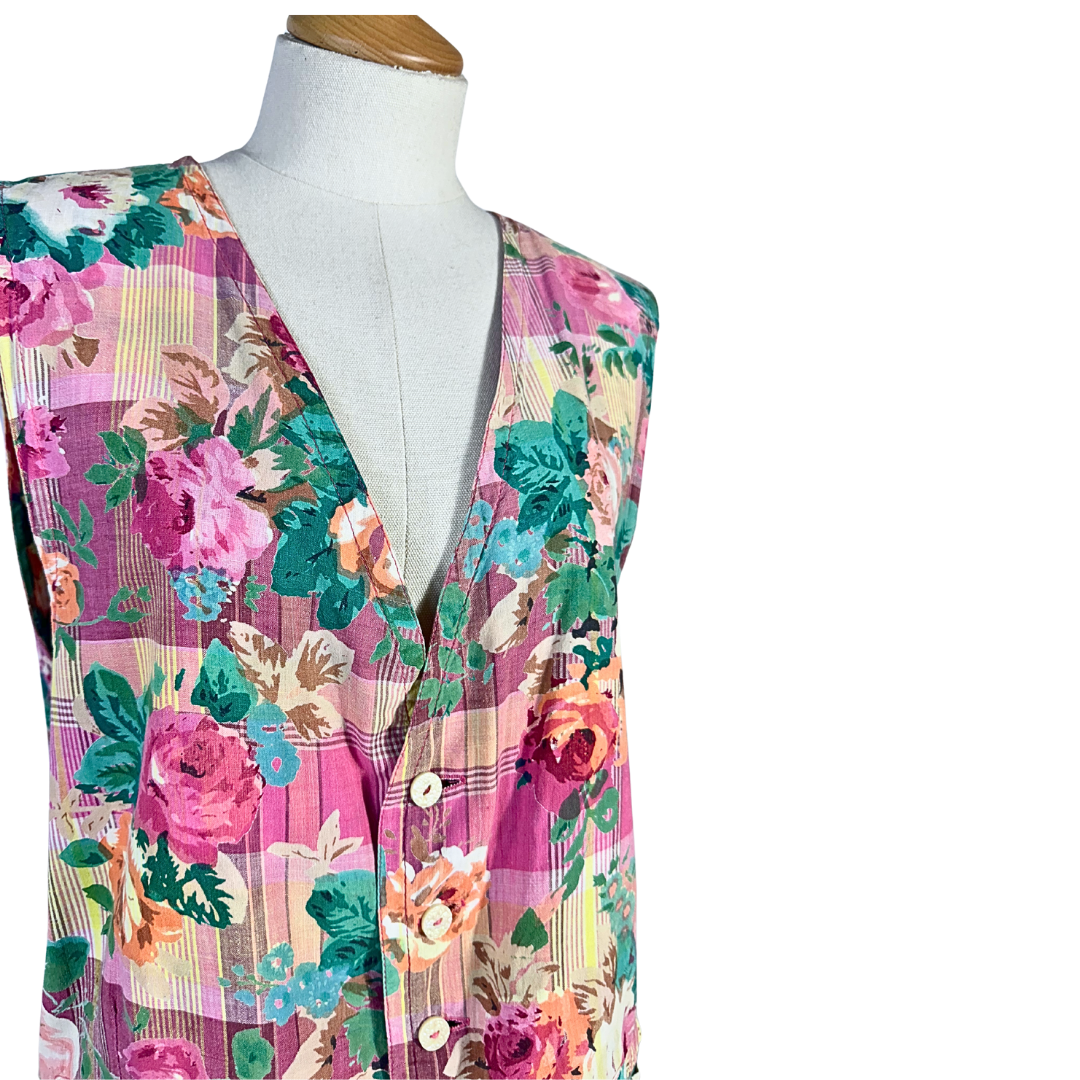 Pink, green, and yellow vintage floral waistcoat. Has two front pockets.