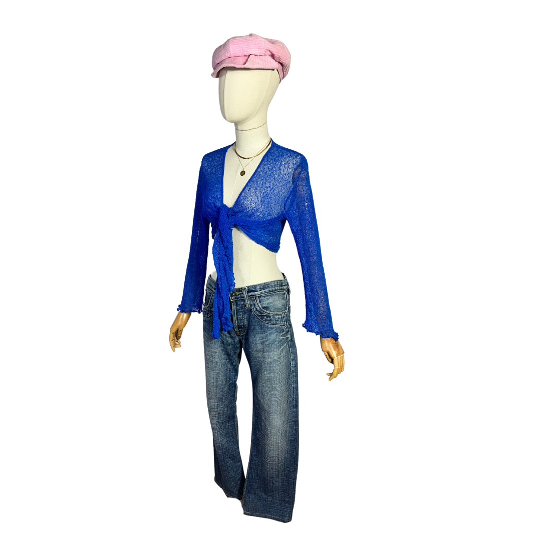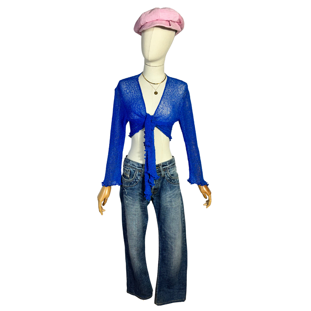 Blue Y2K Diesel low-rise denim jeans. Has a button and zip closure, belt loops, and pockets.