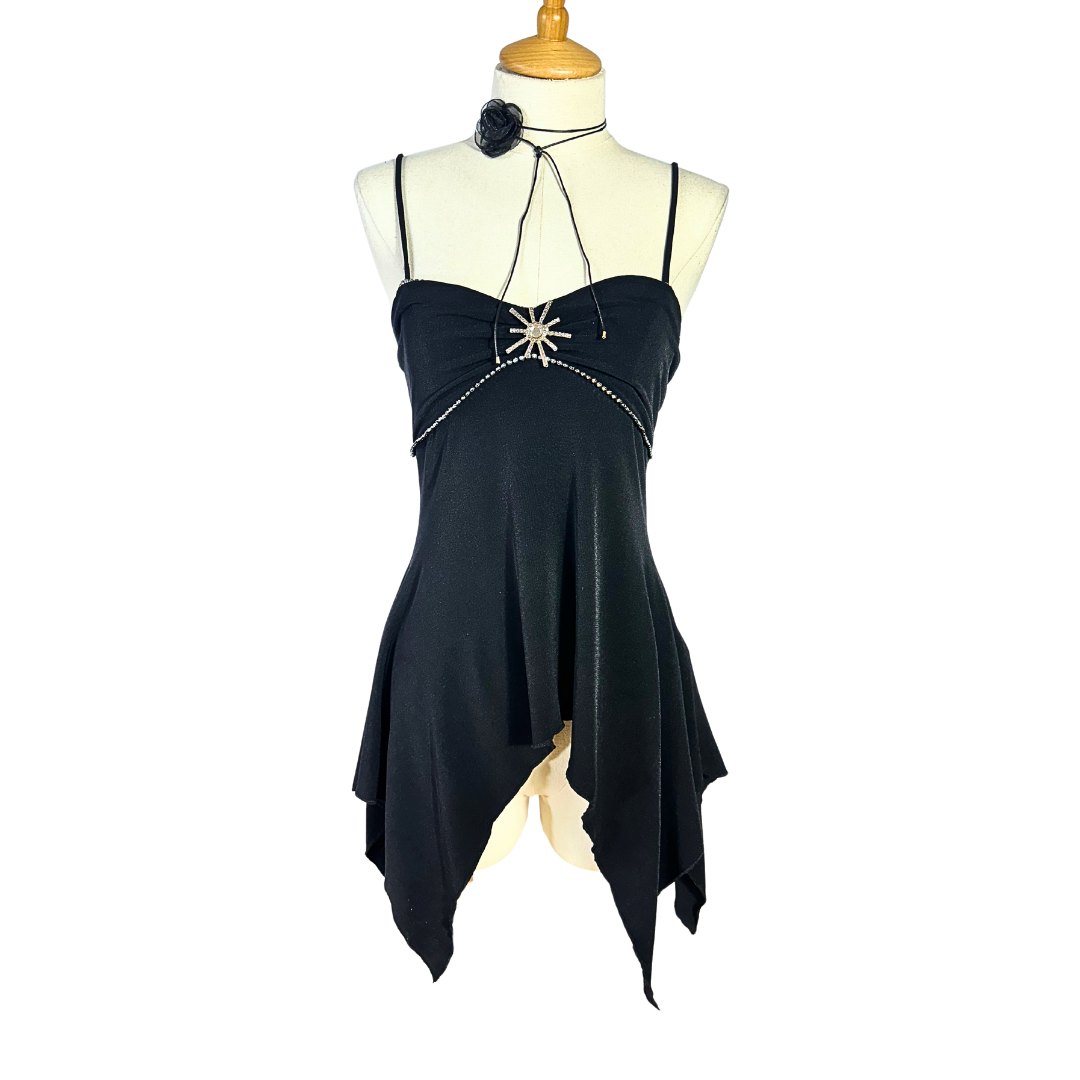Black Y2K spaghetti strap fairy hem top with decorative sun on the bust area. Fabric has some stretch to it.